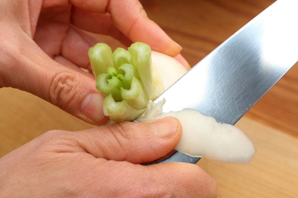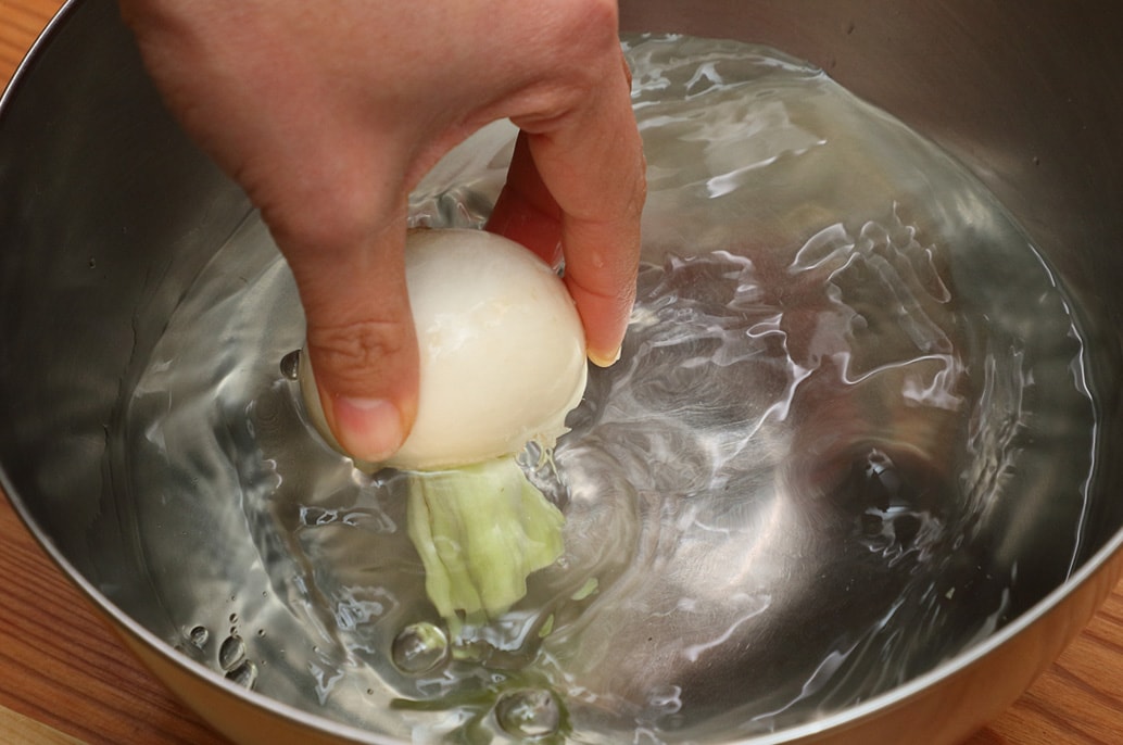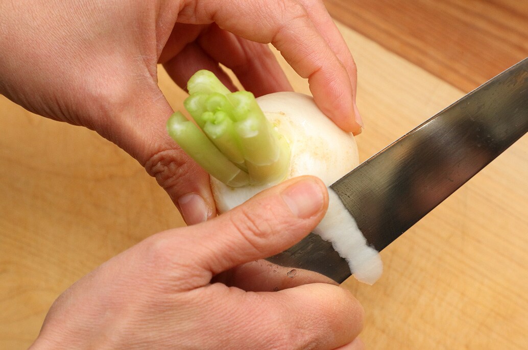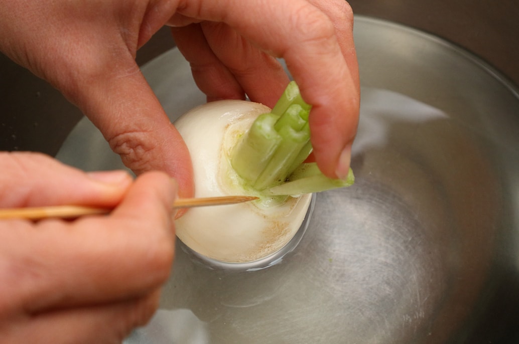This method leaves a bit of stem for color. Trim the greens, leaving about 3 cm (1.2 in.) of stem attached. Place the turnip in a bowl of water with the stem end facing downward and swirl gently to wash. Spread the overlapping stem sections, scrape out any dirt with a skewer or toothpick, then rinse thoroughly. Peel from the root end toward the stem in vertical strips. Stop the knife at the stem base and lift to cleanly remove the peel right up to the stem.