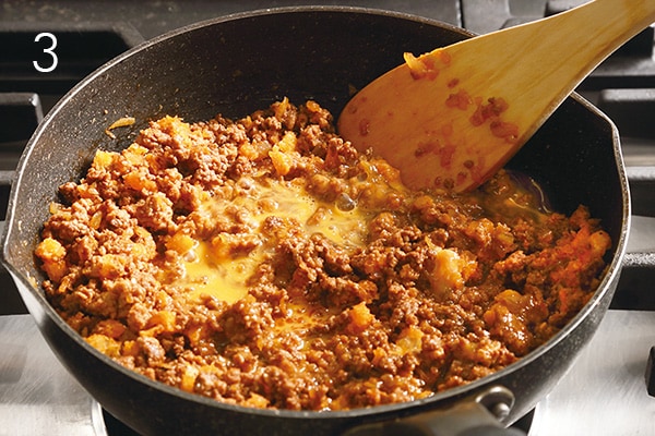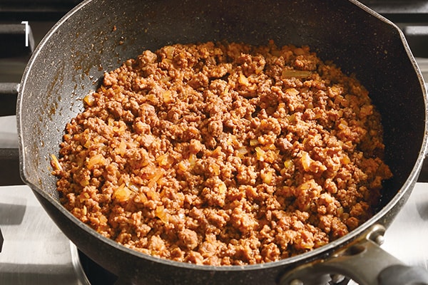 To prepare the meatloaf, sauté chopped onion in a frying pan in 1 t vegetable oil over low heat. Cook until translucent, then remove from pan. In the same pan, add 1/2 T vegetable oil and sauté the ground meat over high heat until color changes. Reduce heat to low, add the sautéed onion and mix well. Add tomato paste and soy sauce, mixing completely with the meat. Season with cumin and black pepper. Turn off heat. (1)