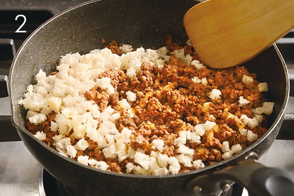 Add bread cubes to the meat mix in the frying pan and stir until well blended. (2)