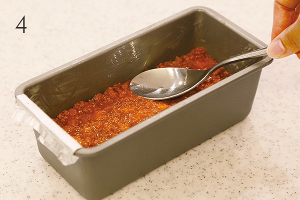 Prepare 2 mini loaf pans (16 x 7 x 6 cm / 6.3 x 2.8 x 2.4 in.) and grease with butter. Line the bottom of each with a strip of foil wide enough to cover the base and extend up one side for easy removal after baking. Grease the foil with butter. Divide the meat mixture evenly into both pans, pressing on the meat with a spoon to smooth the surface and release any trapped air. (4) Bake in a preheated 180°C / 356°F oven for about 25 minutes, or until meatloaf surface springs back when lightly pressed. Rest both loaves before removing. Place on a plate with bottom sides facing up.