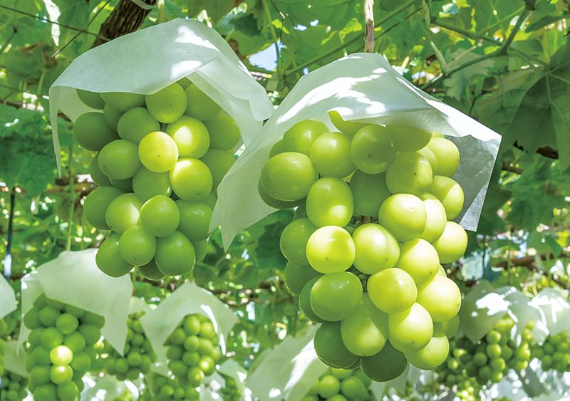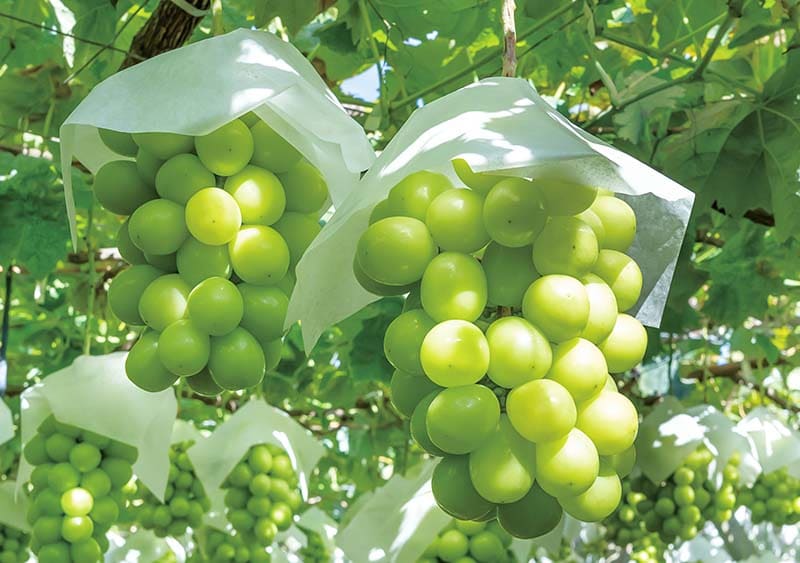 Shine Muscat grapes were developed in Japan in the early 2000s. This premium grape cultivar represents over thirty years of crossbreeding between European and American varieties, and was designed specifically to suit Japan’s climate. Harvested from around August to October, Nagano and Yamanashi prefectures are the primary growing areas for the Shine Muscat, having climates that offer significant temperature differences between day and night.