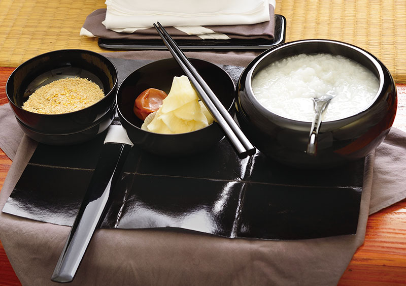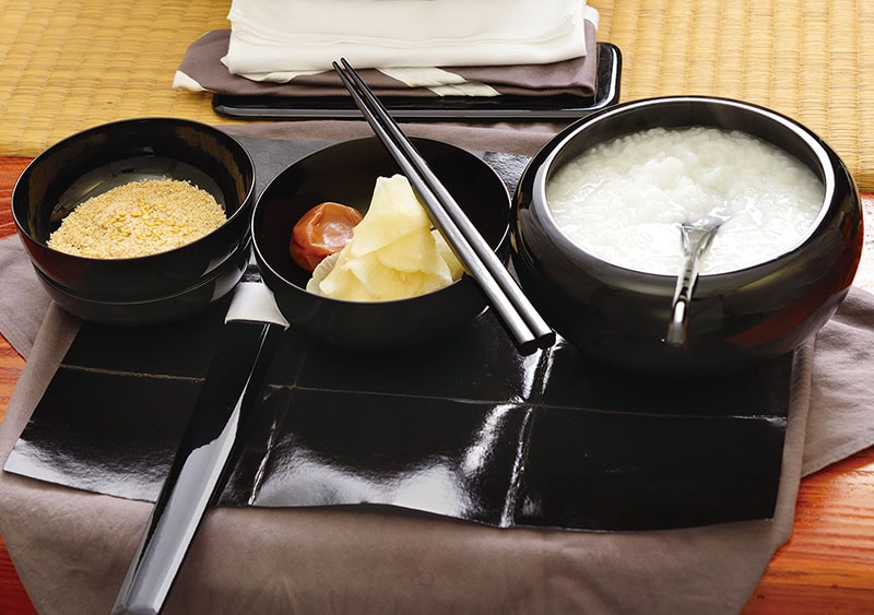 Typical menus might be as follows: for breakfast, rice porridge (okayu), a mixture of salt and sesame seeds as a topping, and a side dish of pickles; at midday, steamed rice mixed with barley (mugimeshi), miso soup, pickles, and one or two side dishes; and for the evening meal, steamed white or mixed rice, miso soup and pickles, accompanied by a few additional dishes. The type and number of dishes vary according to services being performed on a particular day.