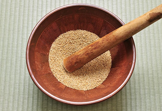 Kitchen staff then prepare meals for visiting worshippers and guests, some of whom may include high-ranking priests from other temples. These meals are served on elevated lacquered tray-tables, and comprise assorted dishes that include simmered and/or dressed seasonal vegetables. Close attention is paid to their appearance and detail, so as to express hospitality and convey respect. The centerpiece of these guest meals is goma-dofu, sesame tofu, which is made in a series of deliberate and meditative steps: first, sesame seeds are carefully toasted to bring out their aroma, then ground with mortar and pestle into a very fine powder, which usually takes about an hour. Kuzu starch and kombu dashi stock are added to the powdered sesame. The mixture is stirred for another hour in a large pot over low heat as it forms a thick, smooth consistency; it is then poured into a mold and cooled in water overnight. It is finally cut into squares and served with miso sauce and grated wasabi.