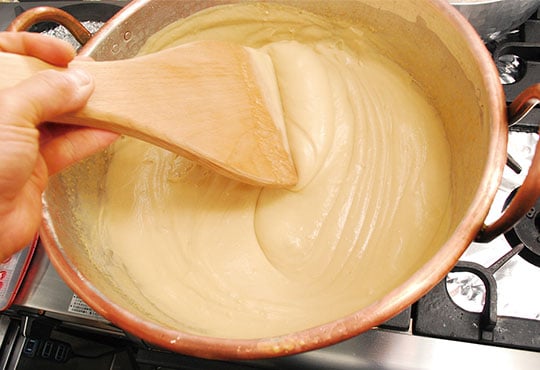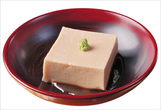 While performing the time-consuming processes of grinding and stirring, if the cooks are distracted by unrelated thoughts brought on by fatigue, the goma-dofu may lack the proper consistency, so that it cannot be cut into clean shapes. Beautifully shaped blocks of goma-dofu result only if the cooks concentrate wholly on their work with the same clarity as if they were practicing zazen in their formal robes. Goma-dofu made by a master cook has a firm set shape, yet is very soft and viscous; it yields easily when divided with chopsticks. As soon as it enters the mouth, goma-dofu dissolves and releases the rich flavor of sesame.