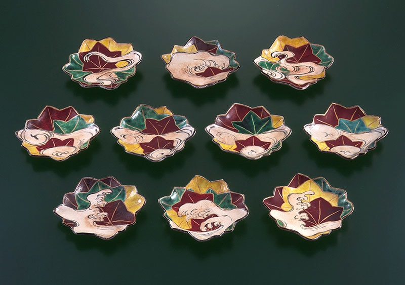 Many of Kenzan’s pieces incorporate classical literary themes, perhaps reflecting the upbringing and lineage of the Ogata family and the culture of Kyoto. This thematic imagery is expressed in his Tatsutagawa mukozuke: their maple leaf and flowing-water motif, seemingly a straightforward evocation of autumn, conceals refined sensibility and cultivation. If they should notice that the design represents the Tatsuta River, famed for its autumn maples, and recall even a single piece of classical poetry related to that site, the tea gathering will almost certainly be enlivened by spirited conversation. Such is the nature of Kenzan’s work: endlessly profound, revealing greater depths the more one learns about it.