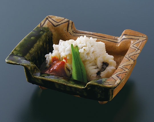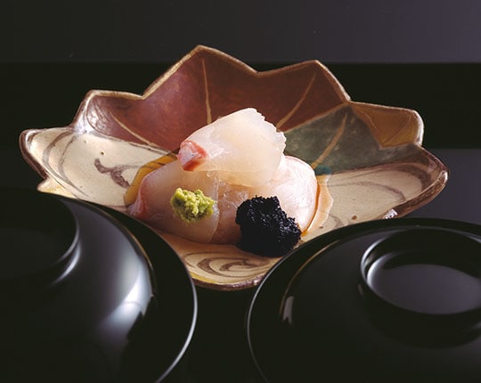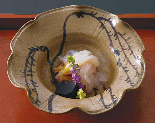 The relationship between Japanese cuisine and its vessels attained its present state by building on pottery and porcelain traditions cultivated over centuries. The result is an inseparable union, wherein diners enjoy food while admiring the ware it is served upon. Perhaps a significant example of this relationship can be experienced through the works of the master craftsman Ogata Kenzan. One of his most acclaimed works is a set of ten overglaze enamel mukozuke dishes—small shallow dishes often used to serve traditional Japanese kaiseki cuisine. This set, titled “Kenzan Mukozuke with Tatsutagawa Design,” features motifs of the Tatsuta River, and is discussed in Hocho Yowa,1 a collection of essays by prominentwashoku chef Kaichi Tsuji (1907-1988). Chef Tsuji was the second-generation proprietor of the restaurant Tsujitome, and was known for his kaiseki cuisine served at tea gatherings.