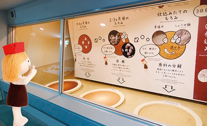 There is so much to explore here! Visitors can experience the color and aroma of soy sauce while learning how soy sauce is made, including all about the fermentation process of moromi, amixture of salt water and soy sauce koji, which ismade from soybeans, wheat and koji mold. Another highlight is touring the historic imperial soy sauce brewery, known as the Goyogura. This is where soy sauce for the Imperial Household has been brewed for generations using the honjozo traditional brewing method. The Goyogura includes a fascinating exhibition that showcases traditional soy sauce production.