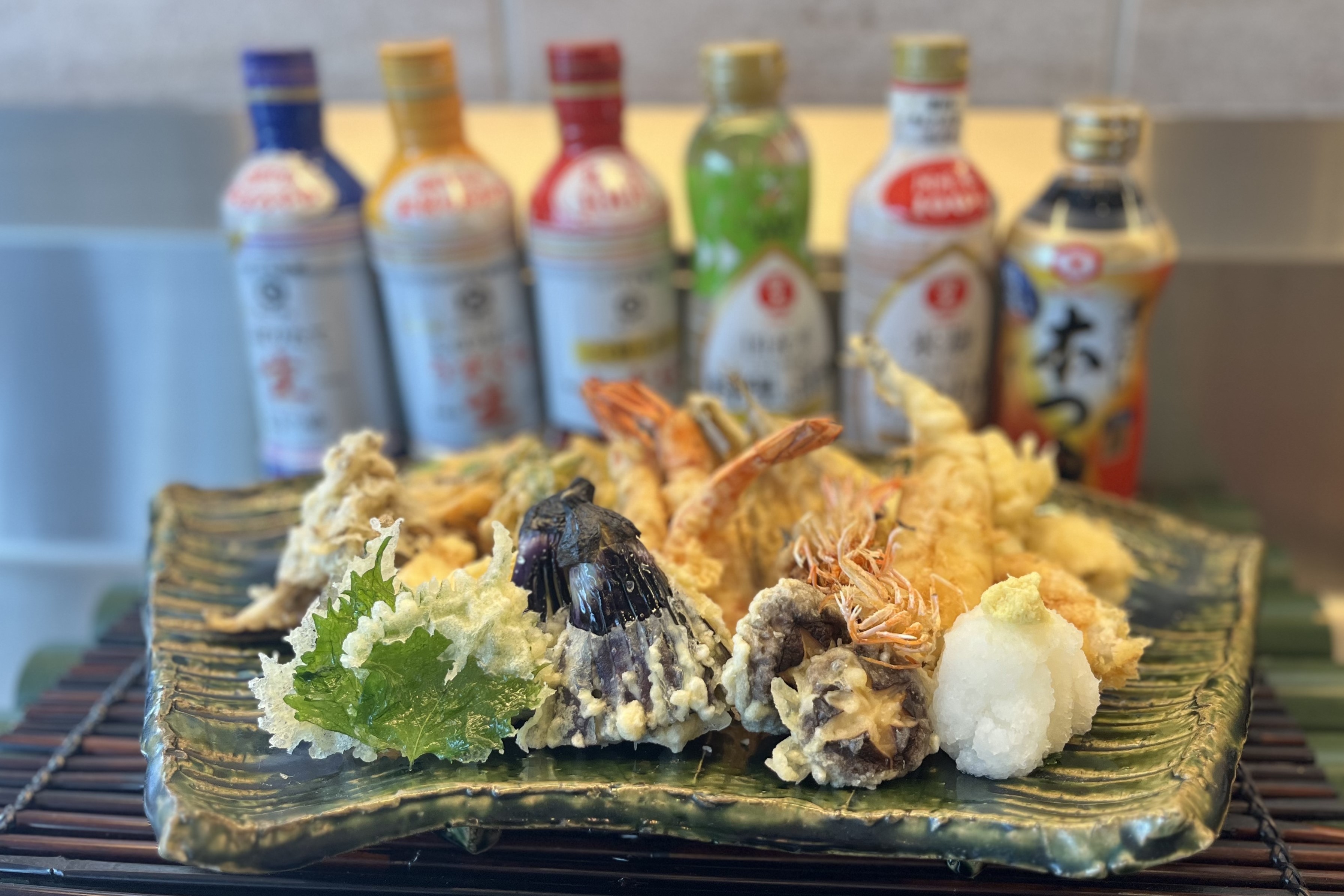 The cooking workshop was held over two days in collaboration with Hattori Nutrition College, a prominent cooking school located in Shinjuku, Tokyo. On the first day, the chefs learned about various types of Japanese knives and sharpening techniques, followed by hands-on practice in vegetable cutting and fish filleting. Using the ingredients they prepared, they deep-fried tempura and prepared tendon (rice bowl featuring tempura), and learned how to blend and use Kikkoman tsuyu (soy sauce-based soups) and tare (soy sauce-based dipping and marinade sauces) to enhance flavor.