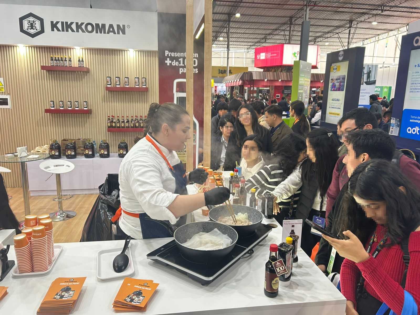 In addition, from September 24 to 26 of the same year, we made our first appearance at the Centro de Exposiciones Jockey trade show in Lima to increase awareness of Kikkoman products. This influential Latin American exhibition attracted around 20,000 visitors. At the Kikkoman booth, we offered tastings of four dishes: Pollo Teriyaki (grilled chicken glazed with teriyaki sauce), Salteado de Carne con Salsa de Soya (stir-fried beef with soy sauce), Yakimeshi (Japanese-style fried rice with vegetables and meat or seafood), and Salmón Marinado en Salsa (julienned sashimi-style salmon lightly marinated in soy sauce, then drizzled with tare sauce). In total, approximately 720 samples were served. Many attendees were drawn by the soy sauce aroma emanating from the fry pan, and the lingering umami flavor was especially well received.