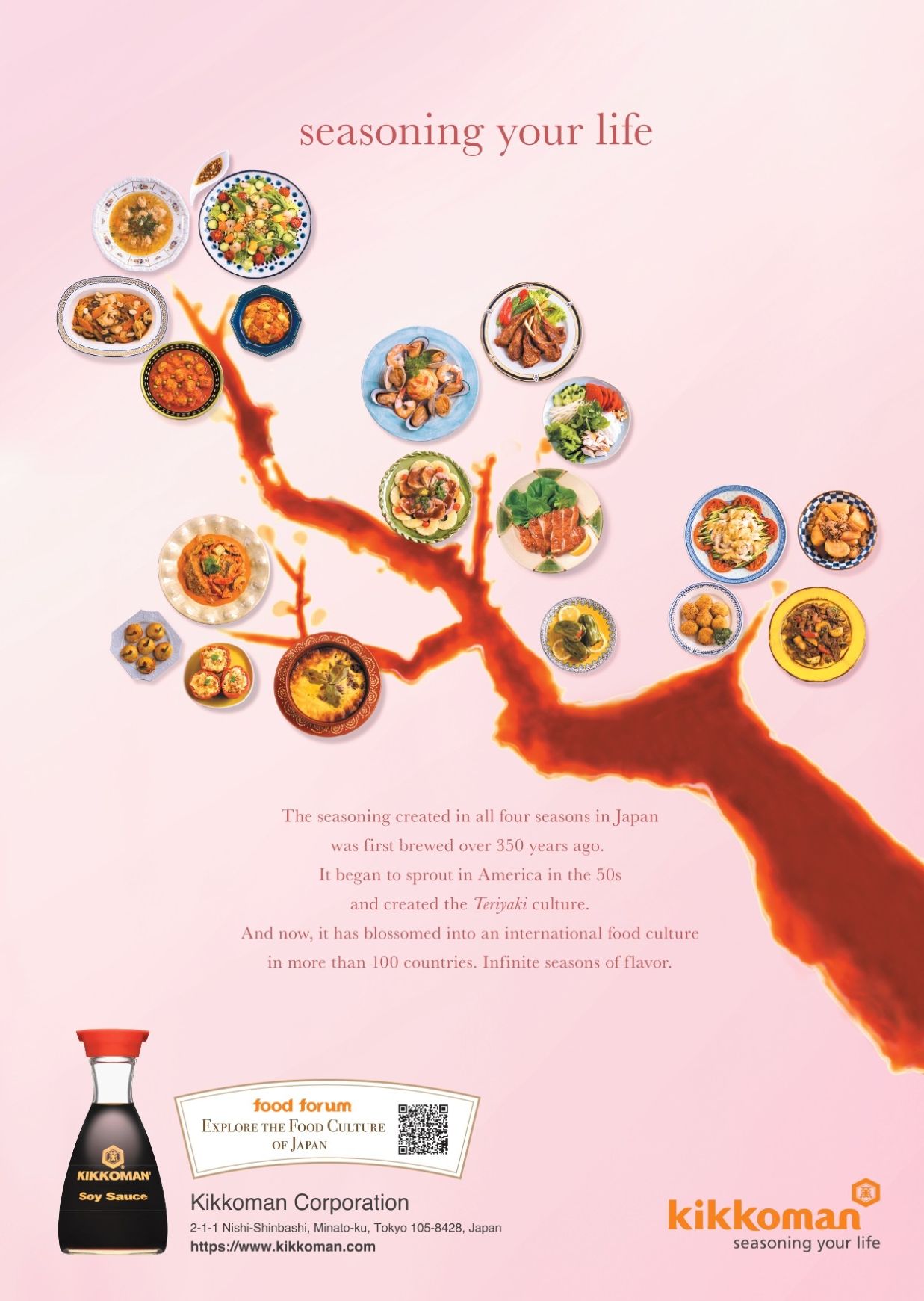 In addition, alongside the corporate brand video, we will also run a new advertisement in JAL’s in‑flight magazine, SKYWARD. This advertisement vividly expresses Kikkoman’s management principle of pursuing the international exchange of food culture, using a symbolic Japanese cherry tree decorated with dishes from around the world made with soy sauce. Since its launch in February, this advertisement has been rolling out across overseas business magazines and other media outlets.