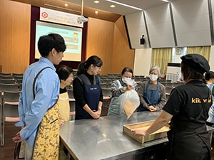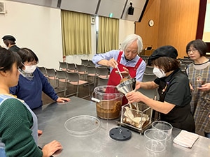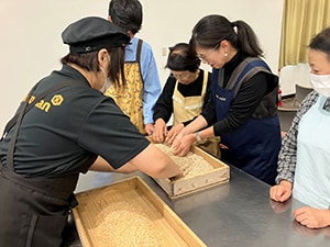しょうゆの原料(大豆・小麦・食塩)をさわったり、香りを確かめたり、麹菌を加えたしょうゆ麹を手で混ぜていただきました。さらに、実際のもろみをしぼる工程を体験いただきました。また、最後にせんべいにしょうゆをぬって焼いて召し上がっていただき、しょうゆの香ばしさを感じていただきました。