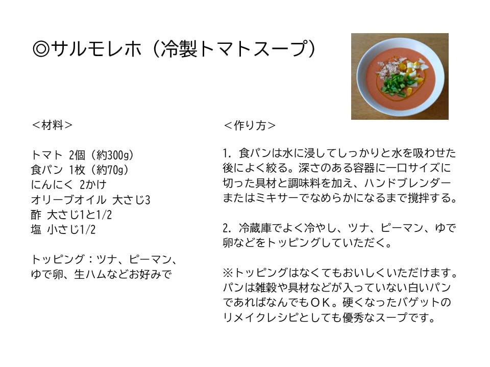 アンダルシア地方はとても乾燥した地域です。パンが主食ですが、翌日になると固くなってしまう。それを水に浸してやわらかくし、トマトとあわせてスープにした「サルモレホ」は家庭でもレストランでも食べられるメニューです。加熱する必要もなく、暑い時期にぴったりです。ポイントはオリーブオイルをケチらないこと。オリーブオイルとにんにくが入ることで、とてもおいしくなります。また、現地ではお酢はいれないのですが、現地のトマトは日本のものより酸味が強いので、私はお酢で味を調整しています。パンは全粒粉などではなく、白いパンであればなんでも大丈夫です。パンが入ることで、全体がもったりとしたペースト状になります。