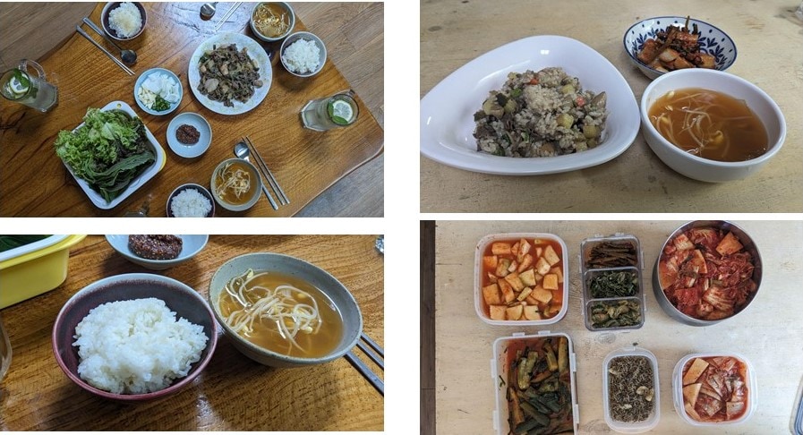 また、別の日にはサンチュに甘辛く炒めた肉をのせて食べました。野菜、肉、ご飯と栄養バランスが整った食事です。翌日は余ったプルコギをチャーハンにしていました。食事にもやしスープがでたとき、夜は温かいスープをいただきましたが、次の日の朝は冷たいままで提供されました。韓国では暑い時期は冷たいスープを食べる習慣があるそうです。冷たいスープはキムチの酸味がより際立ち、パンチの強さが活かされておいしかったです。そのほかに、自家製のキムチが何種類も並びます。これだけで他におかずがなくても、立派な食事になるほどです。