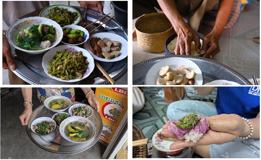 ラオスでは都会も田舎も関係なく、炭火で料理をします。まな板を床に置き、しゃがんで料理をするのが独特でした。主食はもち米です。左手にご飯を持ち、右手で一口取っておかずをつけて食べます。左手がお茶碗がわりのようで、市場でもこのように食べている人をたくさん見かけました。