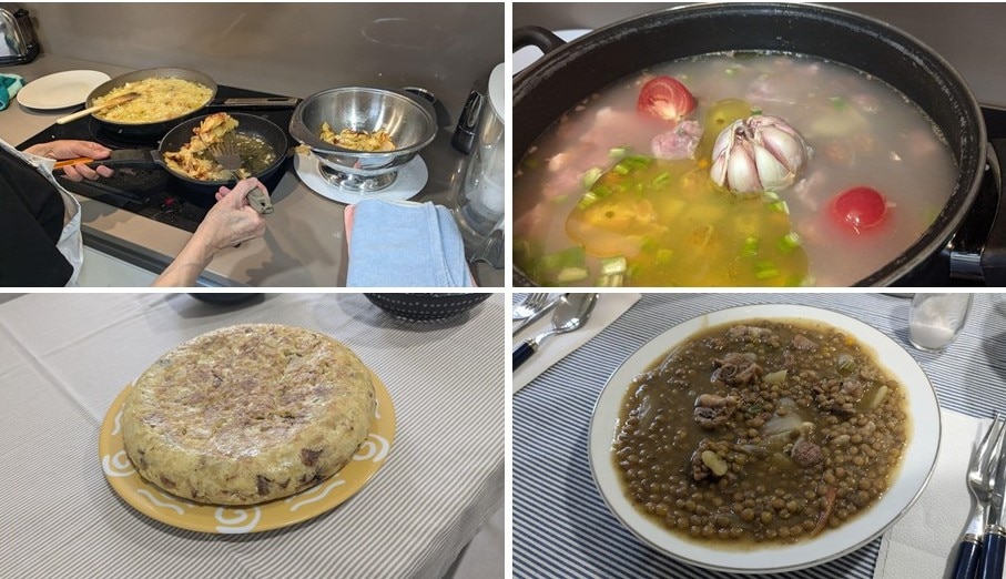 バルセロナでお世話になった家庭は、奥様がとても料理上手で、キッチンもピカピカ。こちらではスペイン風オムレツを教わりました。日本ではいろいろな野菜を入れてつくりますが、現地ではじゃがいもと玉ねぎのみ。それも多めの油でしっかりと火を入れ、卵液を入れてつくる、とてもボリュームのある料理です。これはどこのバルに行っても必ずあります。レンズマメの煮込みは、にんにくを丸ごといれてつくっていました。