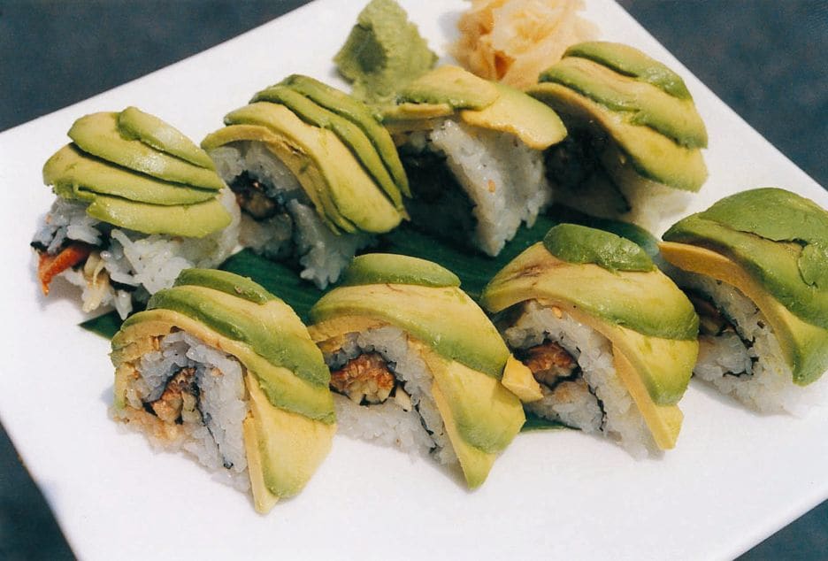 ⑩の写真は「キャタピラー・ロール」という。アボカドをスライスしたもので巻いてあるだけだが、その形がキャタピラー=青虫に似ている。「青虫ロール」では食欲が減退してくるが、「キャタピラー・ロール」ならなんとかなるだろう。
