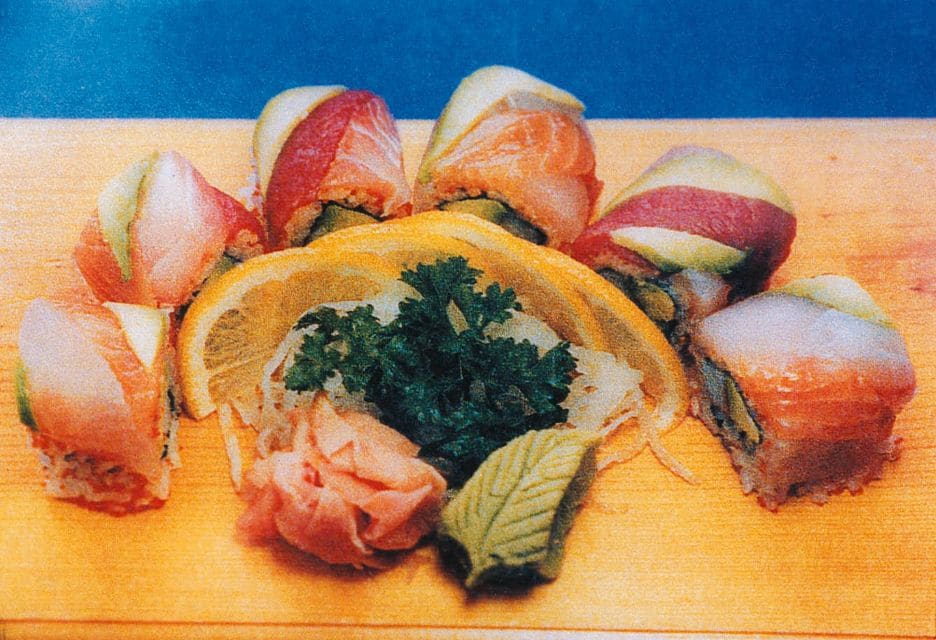 ⑪の写真は、「レインボー・ロール」である。レインボー=虹の部分はマグロ、サーモン、白身魚などを薄く切って作る。「ドラゴン・ボール」というのもある。これは鰻の蒲焼で巻いたもので、龍の背中に似ていることから名付けられた。