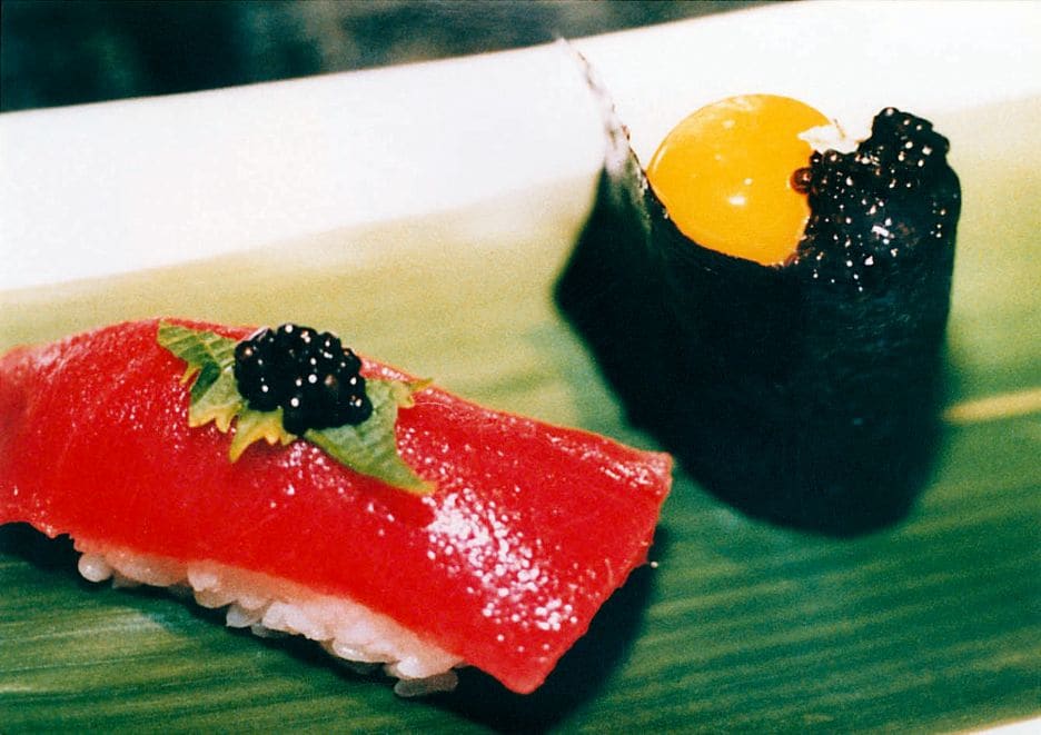 超高級という意味での変り種では、「キャビアの寿司」(⑫の写真右)がある。これで18ドル、約2000円ほどである。⑫の写真の左のトロは9ドル、1000円ちょっとする。2つで3000円を超えるというわけである。また、ニューヨークにある「マサ」という寿司屋は、一人だいたい300ドルから500ドルの超高級寿司を出す。フォアグラ、トリュフ、キャビアなどを使ったり、魚は全部築地から航空便での直送ということで、高額にならざるを得ない。