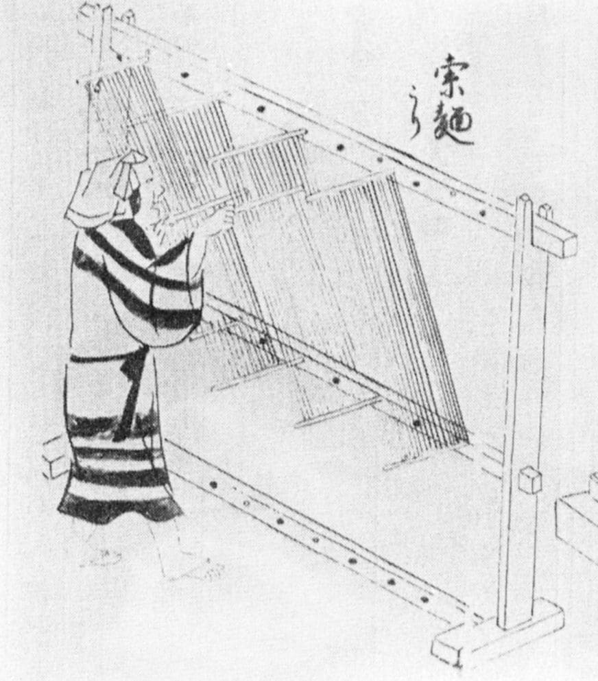 良質の小麦粉を用いる。春夏秋は新しい汲水を使う。水に油を入れ、小麦粉にまぜてこねる。さらに油を加えながらねる。そして太目の箸ほどに引き伸ばす。何本も同じ長さに作る。太い細いのないようにする。1本ずつたるみのないように置き、油紙をかけておく。しばらくして、2本の箸ほどの太さの棒に、これをひねりながらからませて、さらに細く長く引き伸ばす。そして乾燥させる。或いは、油を用いずにこねる。米粉をつけながら伸ばして細くする。さらに米粉を付けて、引き伸ばすこと数度、丸く細長くしたら、不ぞろいのものを取り出し、もう一度、均一になるように伸ばす。そして乾燥する。