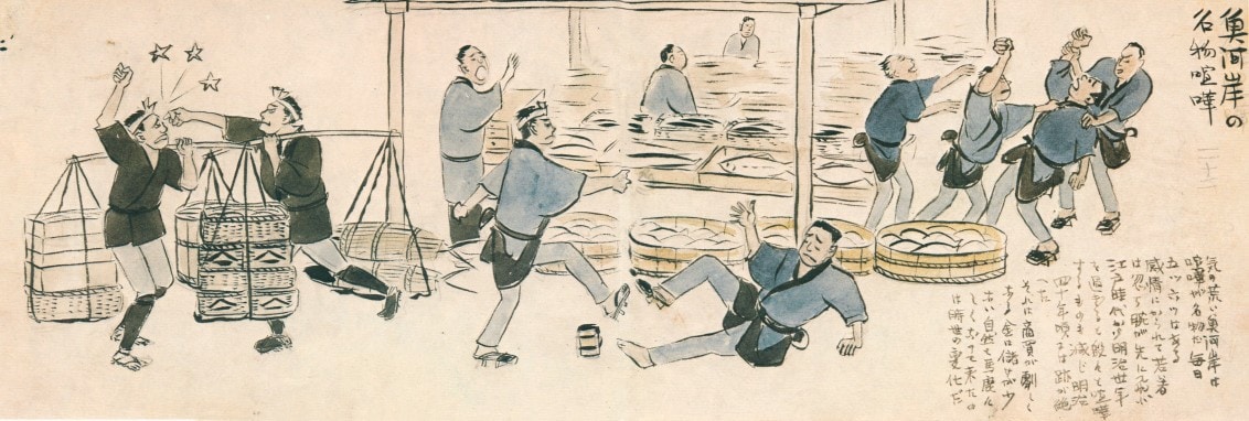 実際に血気さかんな魚河岸の連中にとって喧嘩は日常茶飯事。江戸・明治・大正と300年以上を通じて、魚河岸は喧嘩に明け暮れました。それも小さな小競り合いから歴史的な大喧嘩までさまざまです。