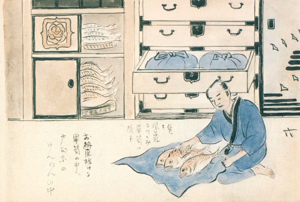 御納屋役所の取立ては、峻厳(しゅんげん)過酷(かこく)きわまりて、問屋・仲買・小売商、泣きの涙に暮れました。河岸の事情に通じる者が取立人に雇われて、御用御用の乱用で、役人風を吹かせます。懐手(ふところで)にして手鉤(てかぎ)持ち、店のなかまでかき回す、小売の飯台(はんだい)取り上げる、どこの問屋に入荷があると、聞けばすぐに飛んでいき、すべてを分捕る凄まじさ。我が物顔で闊歩(かっぽ)する、取立人の横暴に、さても商い成り立ちがたしと、進退窮(きわ)まる魚屋の、一計案じて取るすべは、浜から届くお魚を、右から左に隠しては、つづら長持ち仕舞い込み、箪笥(たんす)の中に秘匿(ひとく)する。ひどい時には雪隠(せっちん)の、鼻をつまんだ隠し事。問屋の店先魚なく家の中では生臭い、まったくもって逆さまのおかしなことになりました。
