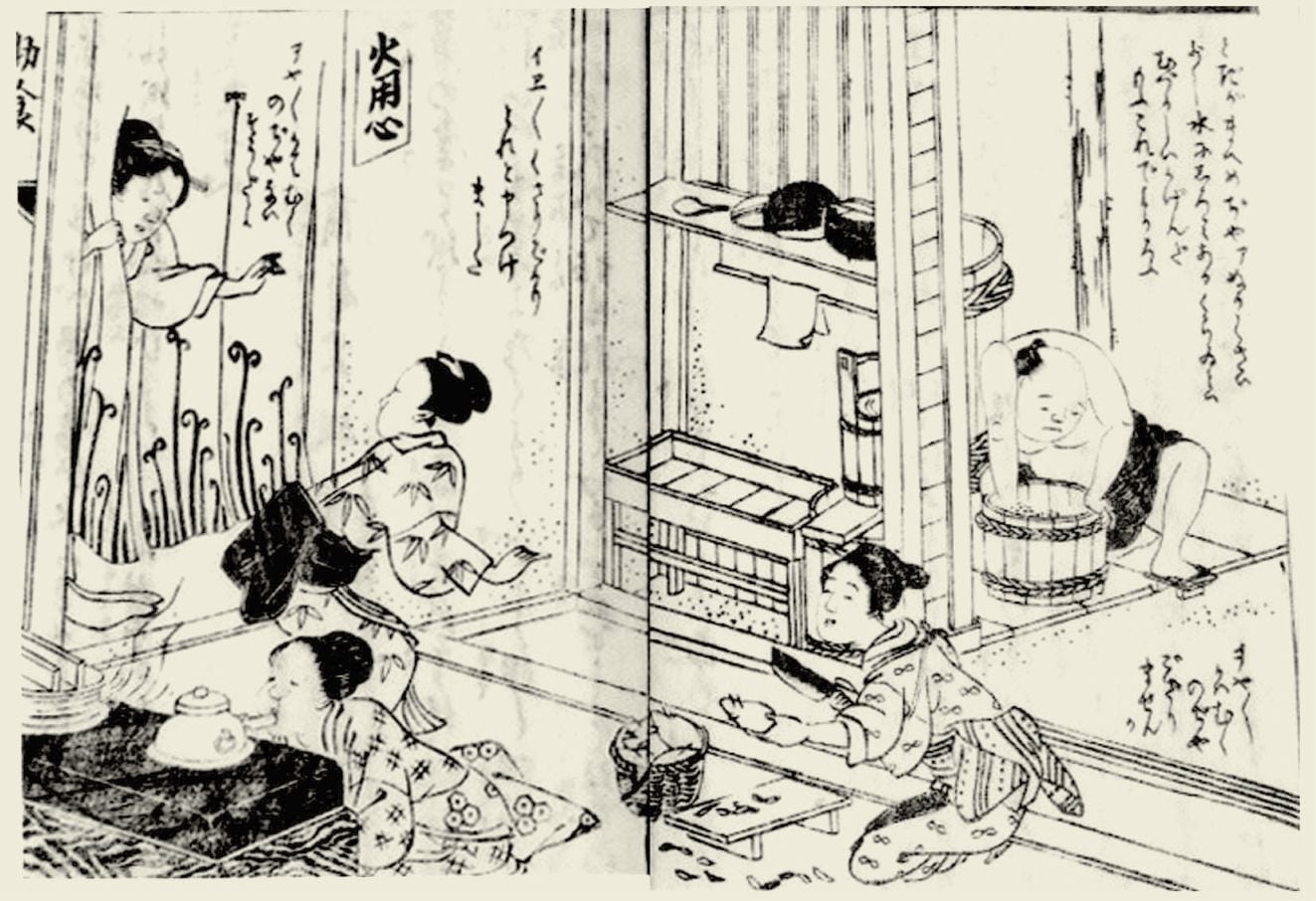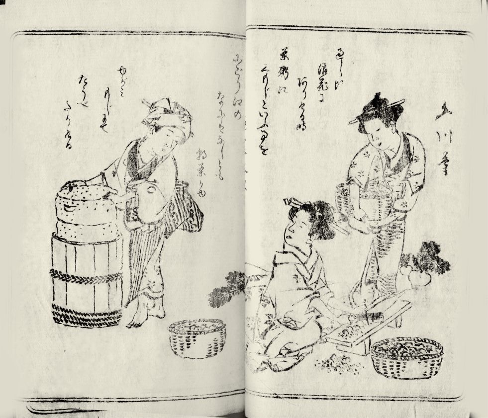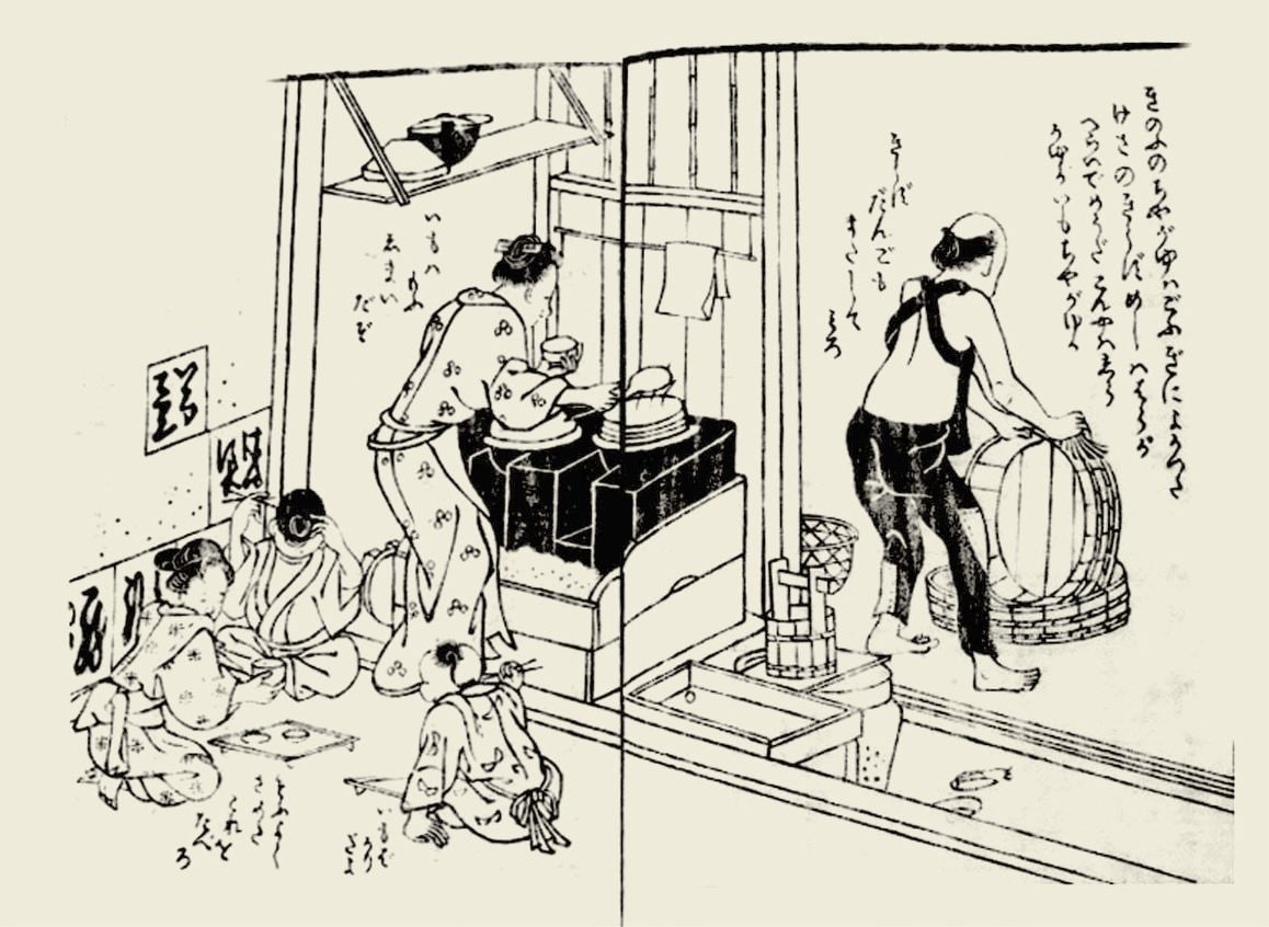 おかずや汁の実には何が一般的であったのだろうか。式亭三馬著『浮世風呂』(1809)は、銭湯に集う人々の日常の様々なおしゃべりを主に描いた滑稽本で、庶民のたくましい生き生きとした暮らしぶりをみることが出来る。