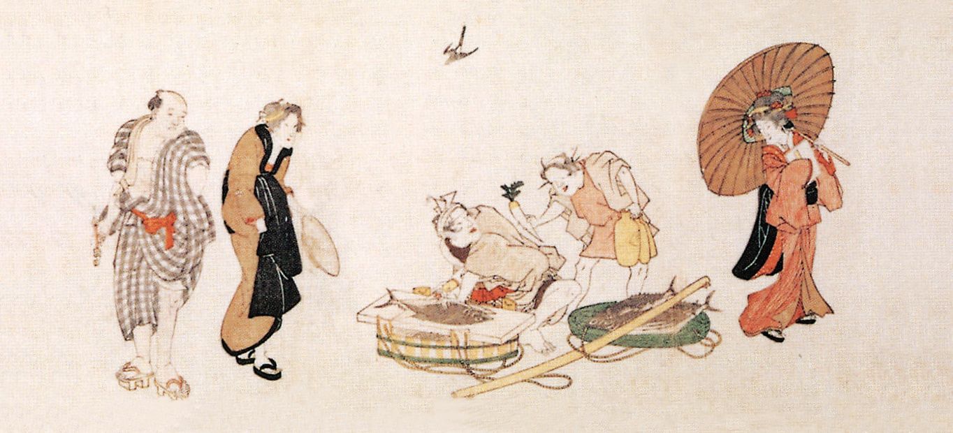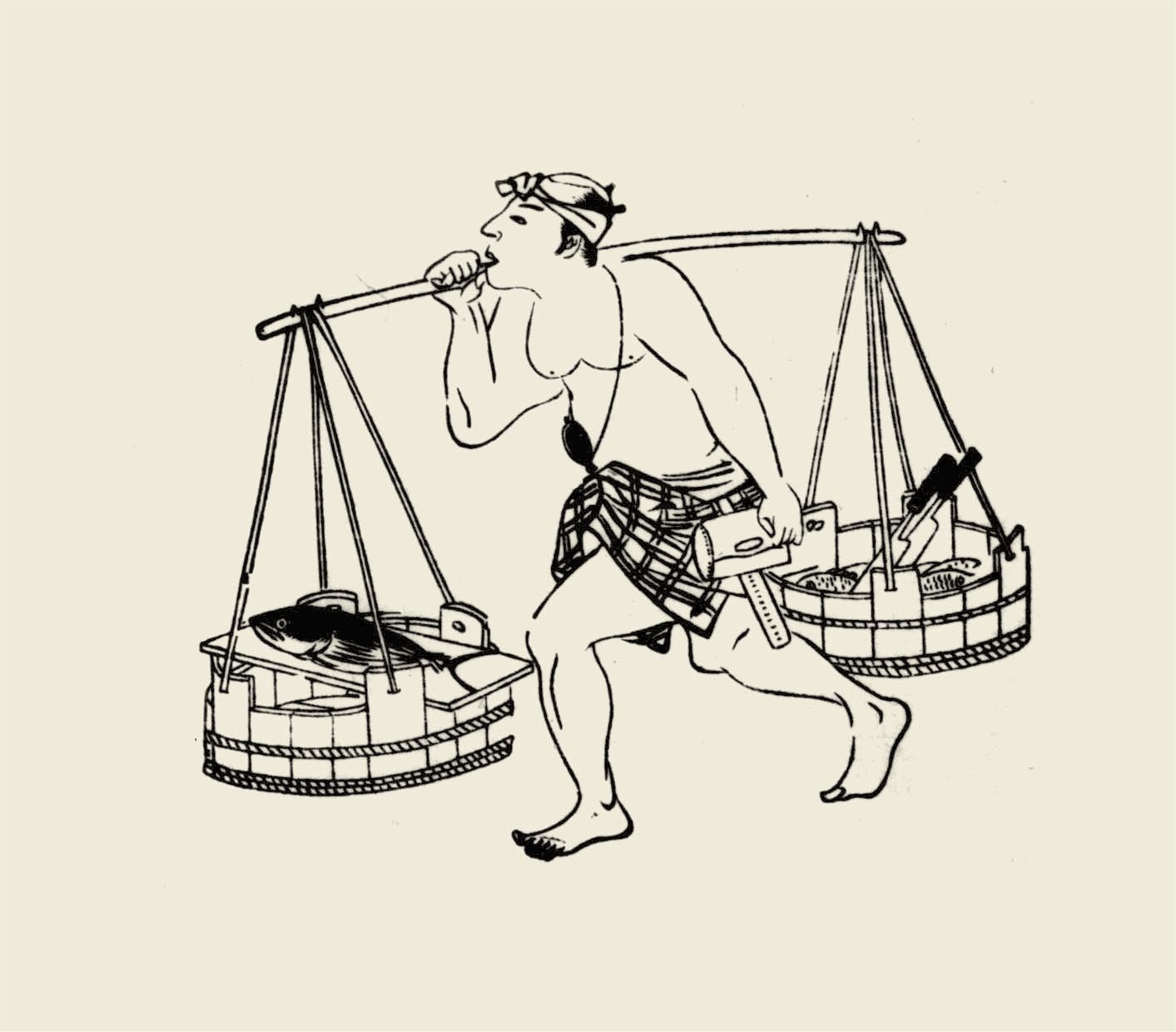 長屋に住む人々の多くが携わっていたという振売りには、実に細かな仕事があった。『守貞謾稿』という喜田川守貞が残してくれた幕末の記録は、江戸と関西の生活の違いを比較しながらきわめて詳細に観察した記録で、庶民の暮らしを知る数少ない貴重な史料として知られている。この中にみえる食に関わる振売りを挙げてみると、乾物売り、鮮魚売り、鰻蒲焼売り、鳥貝・ふか刺身売り、白魚売り、むきみ売り、しじみ売り、ゆで卵売り、鮨売り、いなご蒲焼き売り、塩辛売りなどの動物性食品とそれを調理・加工したものを売る振り売りもあるが、植物性食品やそれを中心とした加工品・調理品もバラエティーに富んでいる。蔬菜売りには、いろいろな野菜を売る八百屋と瓜や茄子など一種を売る前菜(せんざい)売り、松茸売り、生唐辛子売りなどもあった。また加工・調理品では、豆腐売り、納豆売り、漬物売り、甘酒売り、乾物売り、乾海苔売り、蒸し芋売り、揚昆布売り、麹売り、唐辛子粉売り、ゆで豆売り、嘗め物売り、心太(ところてん)売りなどがあった。調味料には、塩売り、醤油売り、ほかに菓子売り、白玉売り、岩おこし売り、飴売りなどや、冷や水売り、水売り(水屋)がある。冷や水売りは、夏に冷たい湧き水を汲み、白砂糖と白玉団子を椀に盛り、一椀4文で売っていたいわば嗜好品である。これに対して水売りは、生活に必要な飲み水を売る商売であった。