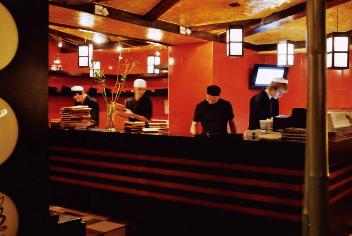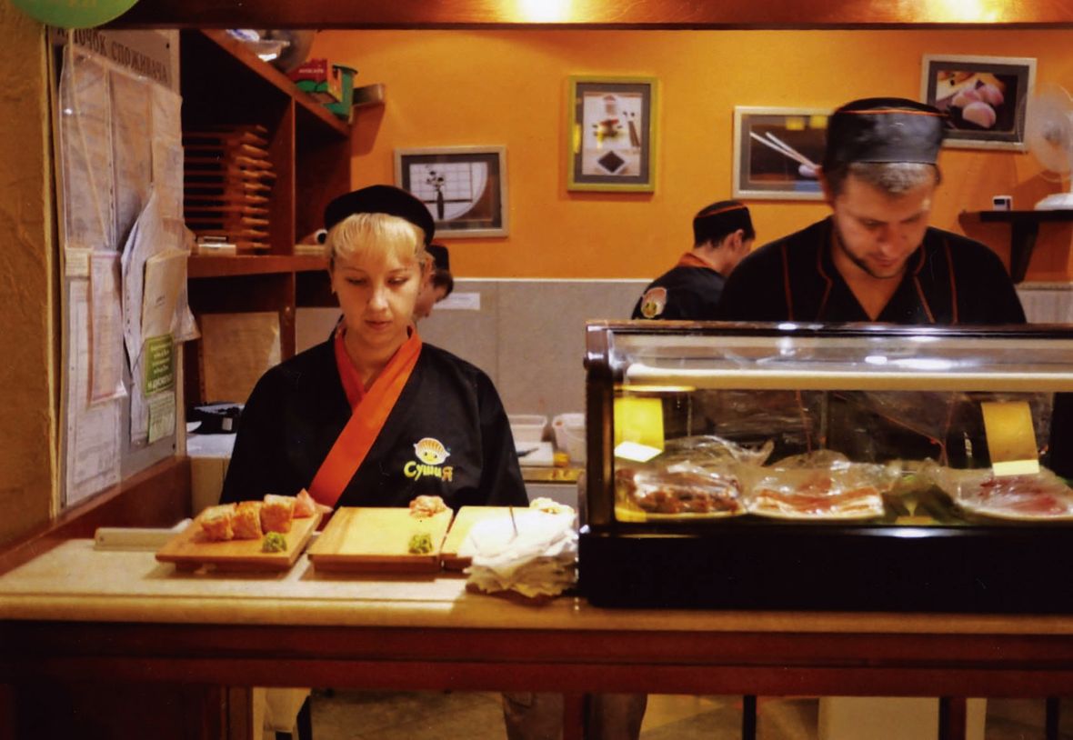 恐る恐るドアを開けると「イラシャイマセ!」という日本語の声が重なって飛び込んできた。客が来ると若い女性のウェイトレス達の全員が一斉に声を張り上げるのだ。内装も本当にファミレスとそっくり同じである。ただ、すしカウンターが一段高い所にあってすしを作っている様子を見せているのが違うだけだ。板前はウクライナ人で、ネタケースは置いてあるがカウンターの前に席はない。すなわちこのカウンターは一種のショー的効果を狙ってのためだ。