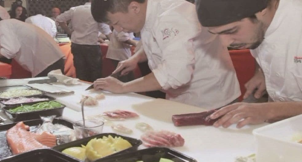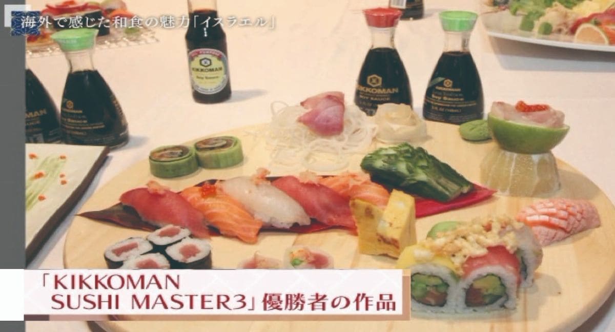 私は中東のイスラエルに行ってまいりました。実はイスラエルのテルアビブには寿司屋さんが200軒、もう既にあるんですね。そこで寿司コンテストをレストラン対抗という形で行いました。今回で3回目「Kikkoman Sushi Master 3」という企画です。30数軒のイスラエルのスシバーやスシレストランの人たちが集まって競い合うのですが、会場にいるプレスやお客さんが、実際につくっている所を見ながら進行していくのです。30分の間にお刺身と巻物と、あとお寿司の3品をひとつのお皿に盛りつけるという、そういう内容でした。