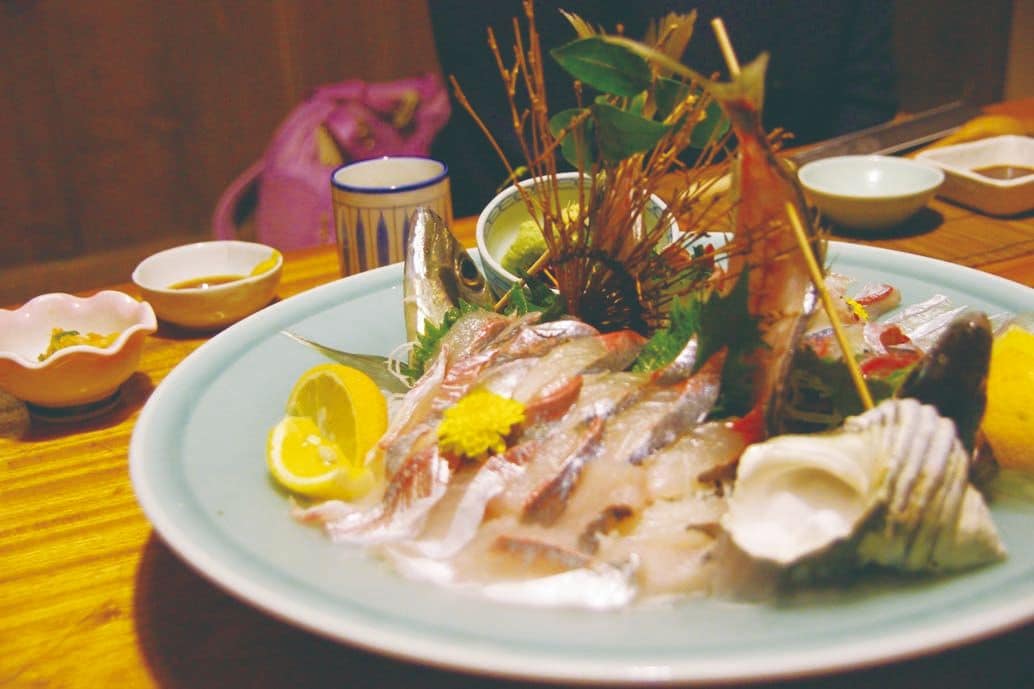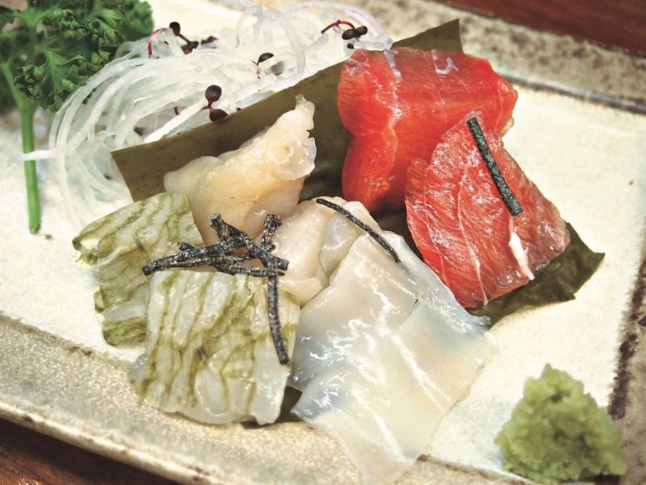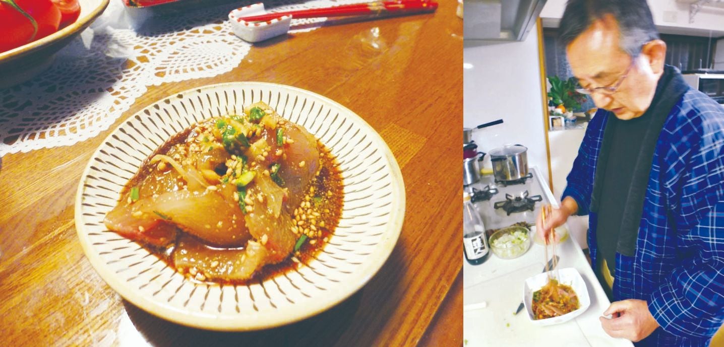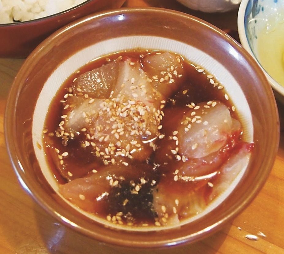 醤油で臭みをとることはもちろん、関東のマグロの漬けとは異なり、タンパク質分解酵素を含むショウガを加えることで魚の表面が少し分解してねっとりとして醤油がからむのである。