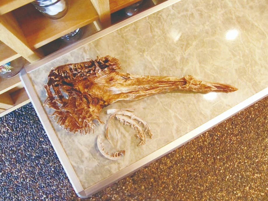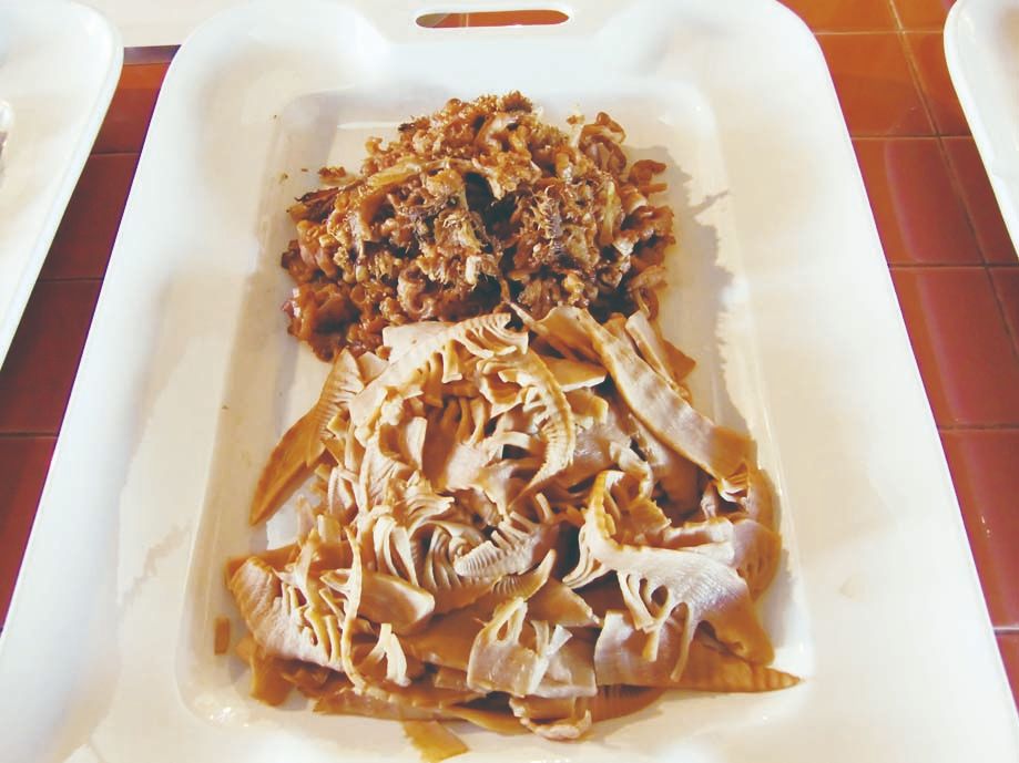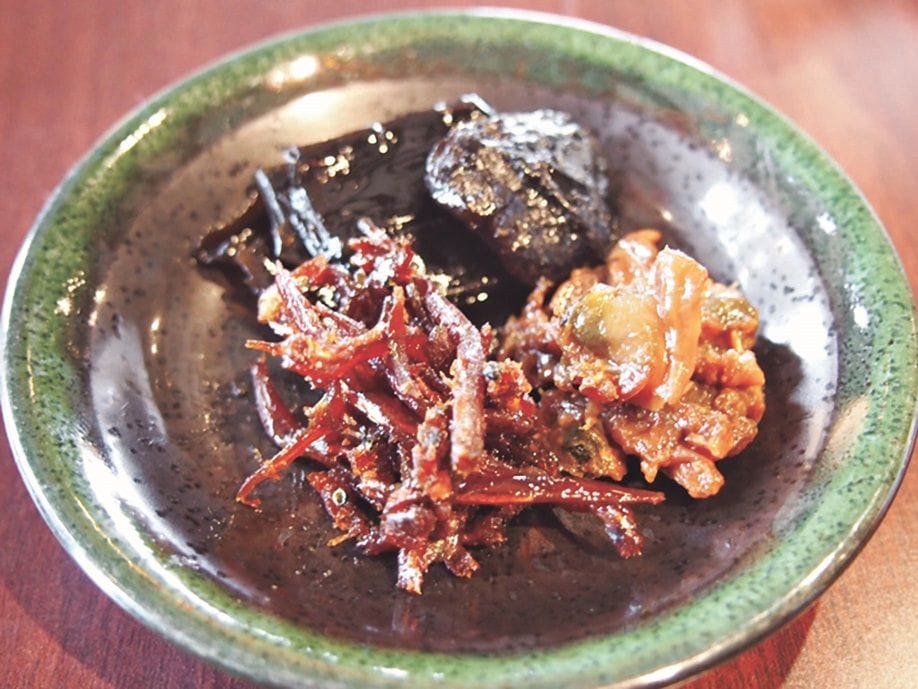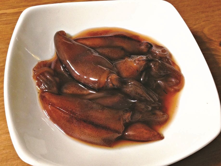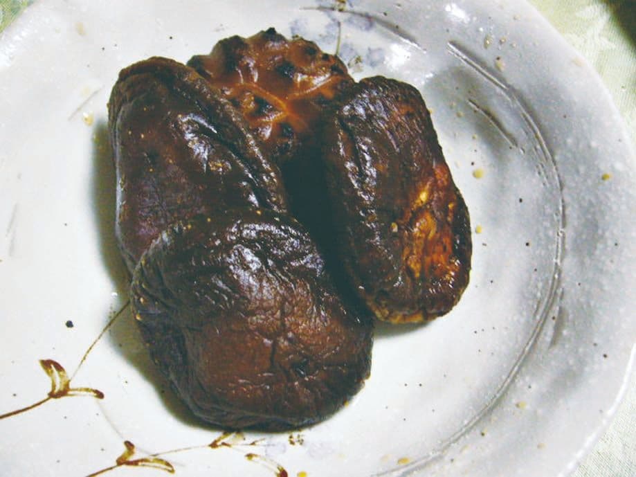 郷土料理は、地元の食材だけなく流通で根付いた料理もある。前号(FOOD CULTURE No.25 p6)江原氏が紹介した大分県日田の「たらおさ(鱈胃)」はお盆に欠かせない料理である。博多商人から伝わったともいわれ、福岡県では「たらわた」の名で食べられている。「たらおさ(乾物)」は、「棒だら」の残りで作られるため、タラの身は途中で売れ、その残りが日田に流通したともいわれている。内陸部にある日田では、魚介は貴重でエラと内臓だけでもおいしく食べようと、現地の食材と融合し、定着、継承されてきたのだ。今日でもお盆には各家庭で作られ、スーパーには「たらおさ」が山積みされている。ここで用いられる醤油だが、大分県下の中でも、日田の醤油は最も甘いといわれている。