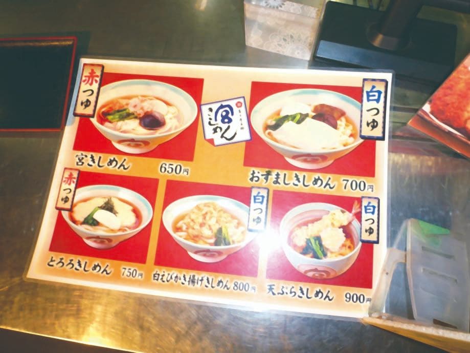 また最近では、白醤油を使った「白つゆ」きしめんが販売されるようなった。それに対し従来のたまり醤油のきしめんは「赤つゆ」といわれる。熱田神宮内にある宮きしめんでは、白つゆは「おすましきしめん」といい、おぼろ昆布、湯葉、かまぼこがのっている。