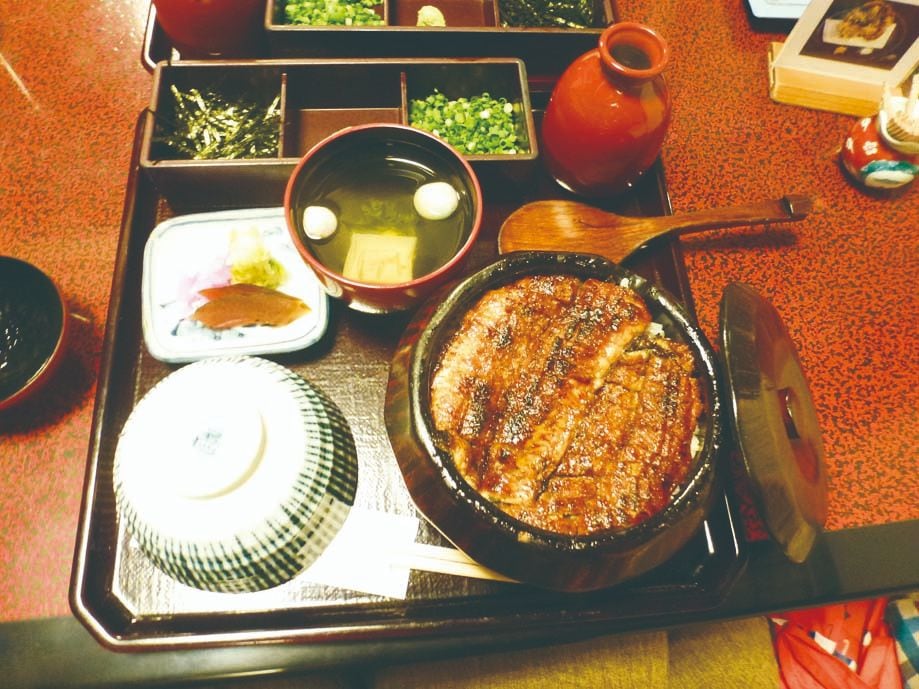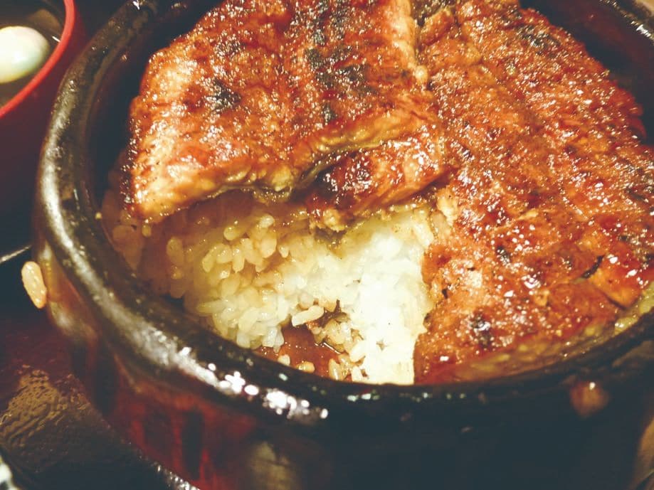 由来は諸説あるが、たまり醤油と味醂のたれで焼いたウナギを、細かく刻んでお櫃にはいった飯にのせ(まぶし)、まずはそのまま。次にネギやわさび、のり等の薬味を入れて。最後はお茶漬けでと、3通りの食べ方をする。