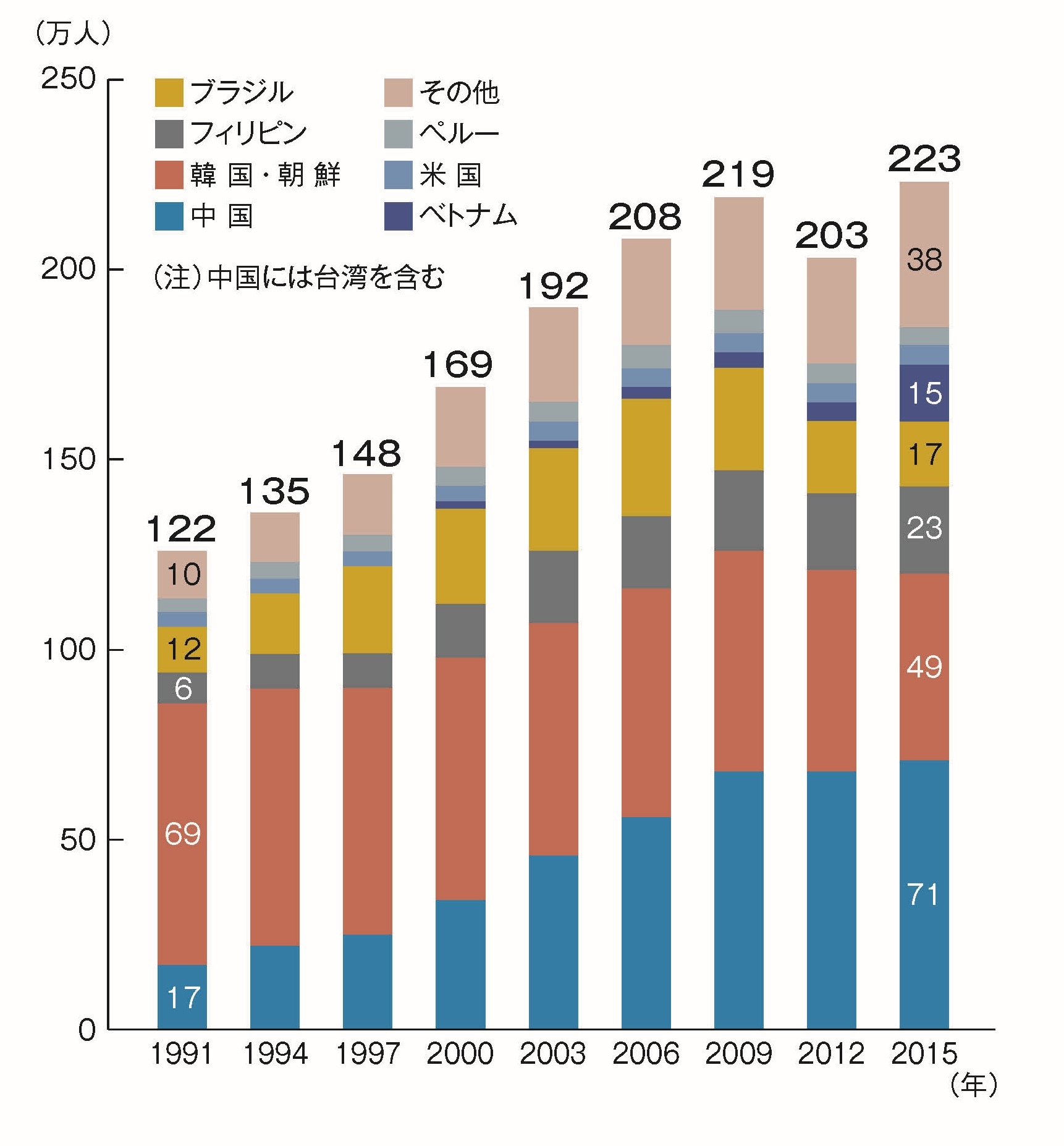 2016年現在の在留外国人の数は(図2)、総数230万人強、その3割近くが中国、2割近くが韓国、そしてフィリピン、ブラジル、ベトナムからが多い。1991年以降の推移では(図3)、総数は2倍近くに増え、中国・台湾、フィリピン、ベトナムやその他の国からの人が増えていることがわかる。