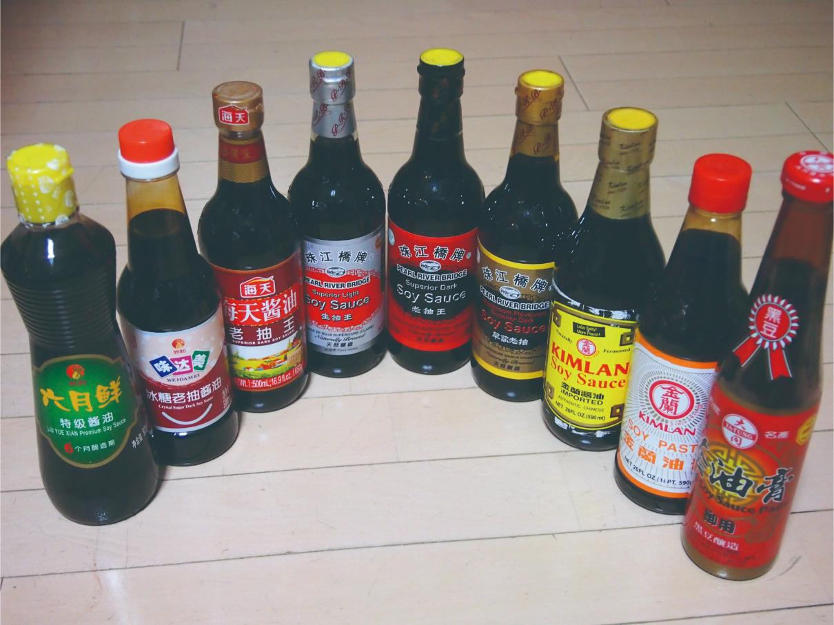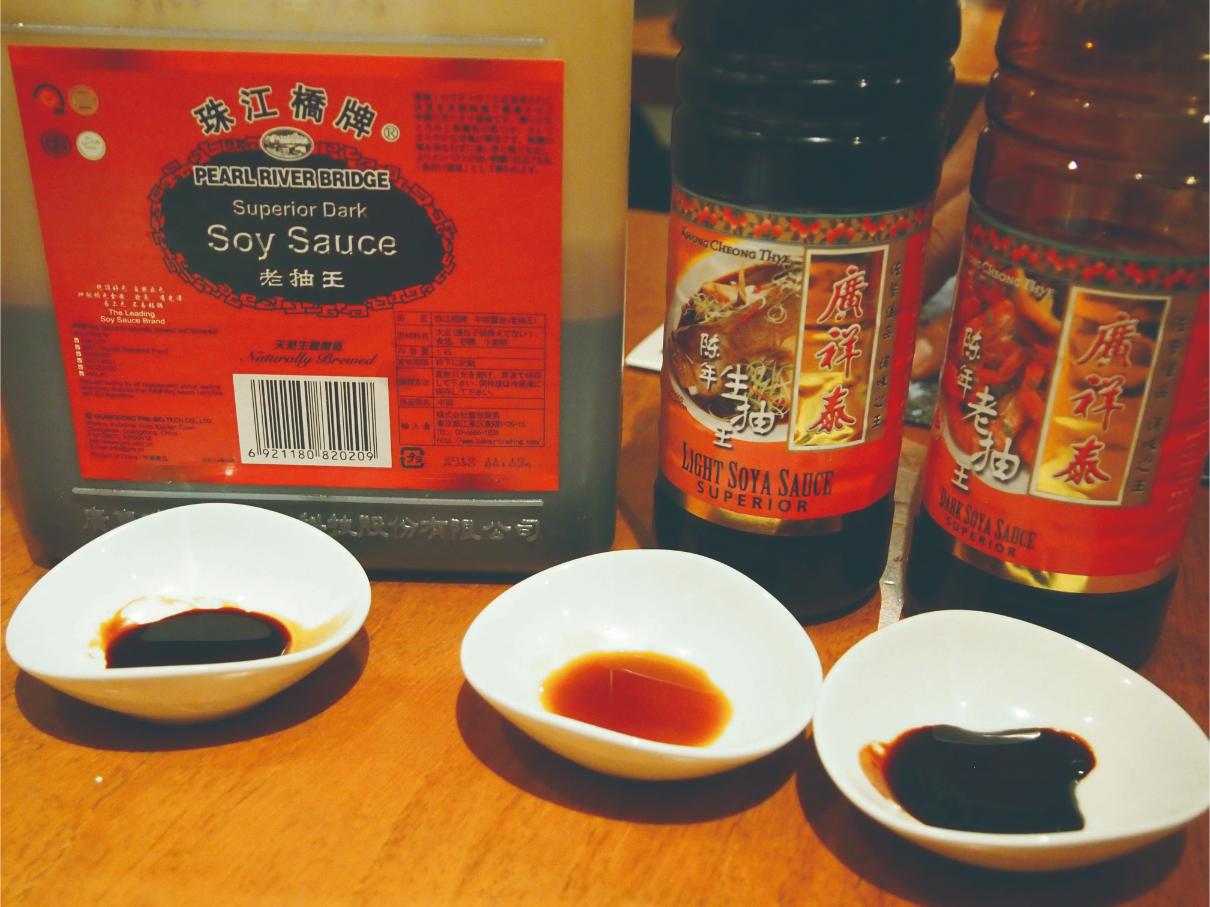 中国のソイソースには、日本語では中国たまりしょうゆと称される「老抽(ラォチュオウ)」と中国濃口しょうゆと呼ばれる「生抽(シュンチュオウ)」がある。老抽は、ドロリとして色が黒く、しょっぱさとほんのりした甘味、カラメルの苦みが強い。生抽は、色が薄く、塩辛さが真っ先に感じられ、主に塩味をつけるために使われる。どちらも大手ブランドのものが、通販やアジア食材店で入手できる。