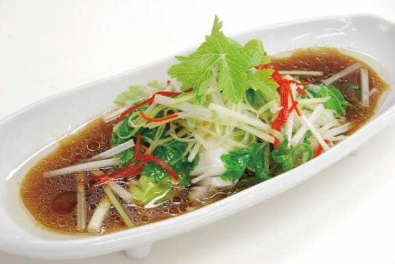 さて、「ベトナム食材店」とインターネット検索してみると、結構な数のお店が広範囲に点在していた。トップにヒットした店を訪ねると、大量の米粉麺や生春巻きの皮が売られる奥に、ベトナムのソイソース ヌックトゥーンがベトナム内の別称でもあるシジャウという表示を付記して売られていた。「よく使うヌックトゥーンは?」という質問に店主が選んだハオヴィ(“濃い”の意味。諸味の一番搾りを使うため窒素含量が多い)タイプは、しょうゆ同様にサラッとしたタイプで、ソイソースフレーバーもうま味も強くて、加熱調理にもつけダレにも向く。また、ベトナムでシェアの高いシーズニングソースのチンスが大瓶で売られていた。どちらもそれ一本で、炒飯でもスープでも味付けが済みそうなバランスのとれた旨い味である。