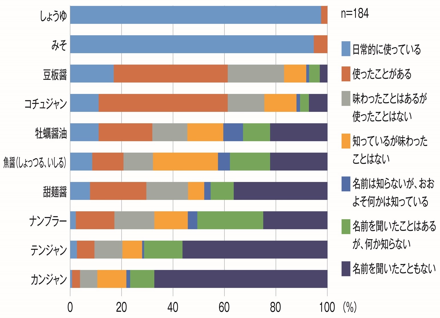 女子大生におけるアジアの発酵調味料の認知度および使用頻度 都内女子大生対象のアンケート調査(2017年1月実施) 認知度・使用頻度の低かったその他の発酵調味料(ケチャップイカン、シジャウ、ヌックトゥーン、カピ、タウチョ、タフレ、タウシ、バグオーン、シーユー、プーティス、マム、トヨ、ジャウハオ、チャオ、トゥーン、パティス、タオチオ、ナンマンホイ、ヌックマム、ケチャップアシン、ケチャップマニス、エクチョ、魚露、チョッカル、ハオユー、老抽・生抽) |