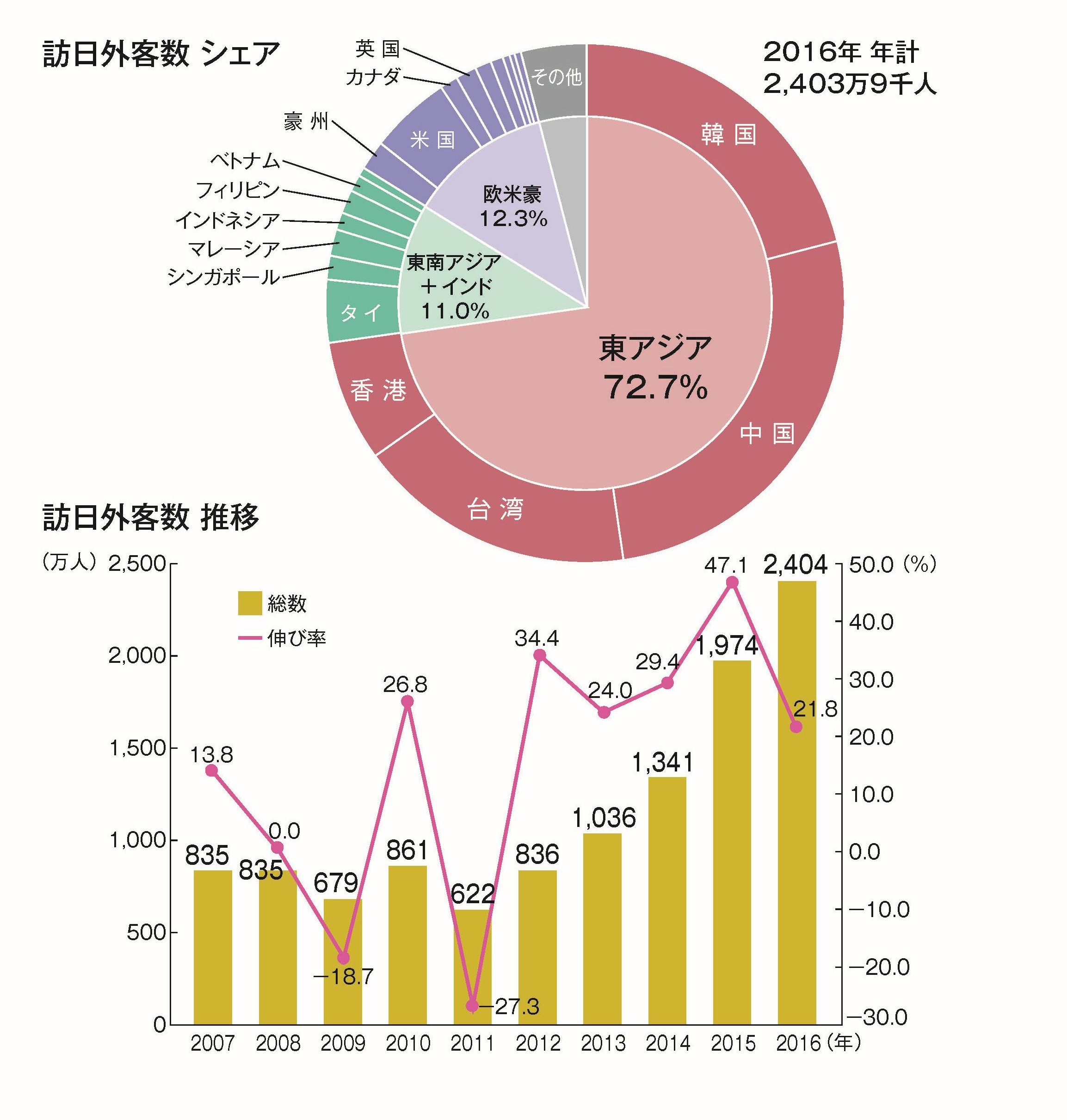 東京オリンピック2020が間近になり、都市部だけでなく地方においても外国からの来日客が増えていることを感じる。その数は、2016年に過去最高の2,400万人を数え、8割以上がアジアの国々からの旅行者であった(図1)。