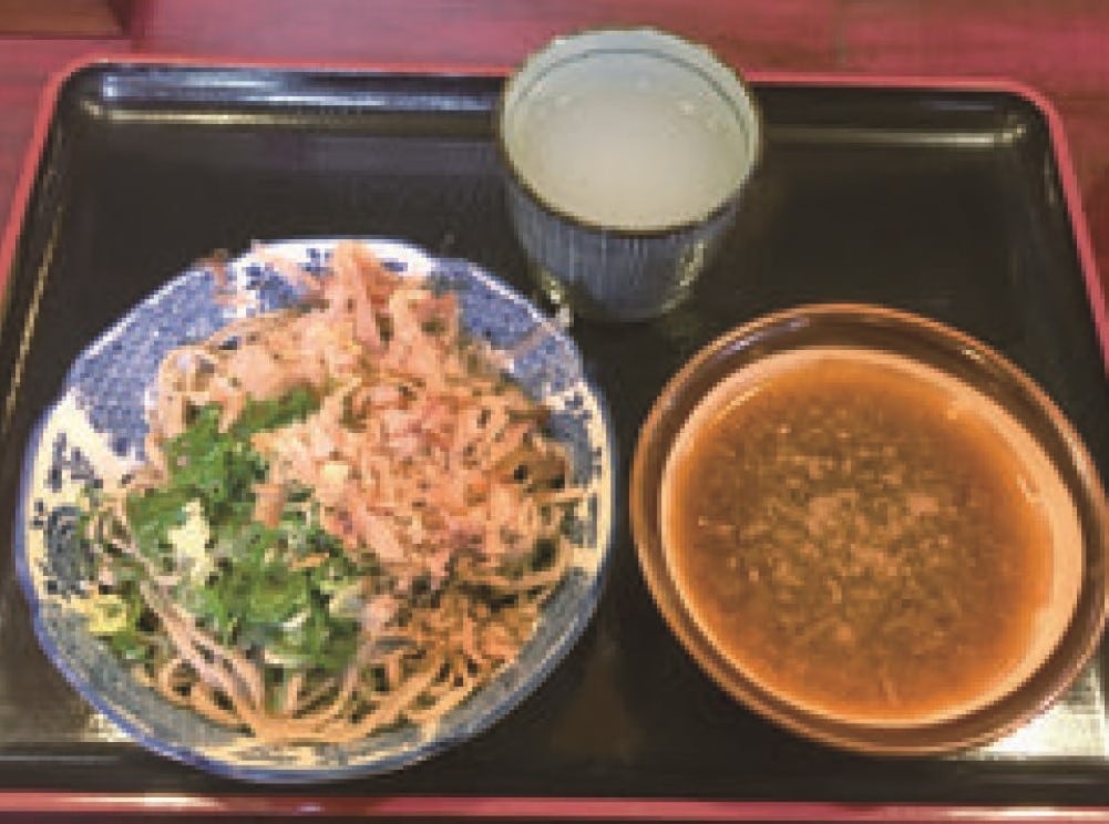 今は全県あげての名物として売り出している「越前そば」は、もともとは武生が発祥の地とされる。冷たい太めのそばにしょうゆ味のだし汁を“ぶっかけスタイル”にして、大根おろしと花かつお、青ネギを混ぜて食べる。つゆの色は明るく、それほど濃くはない。しょうゆが強い関東のつゆに比べ、しょうゆは主張しすぎない名わき役の感がある。
