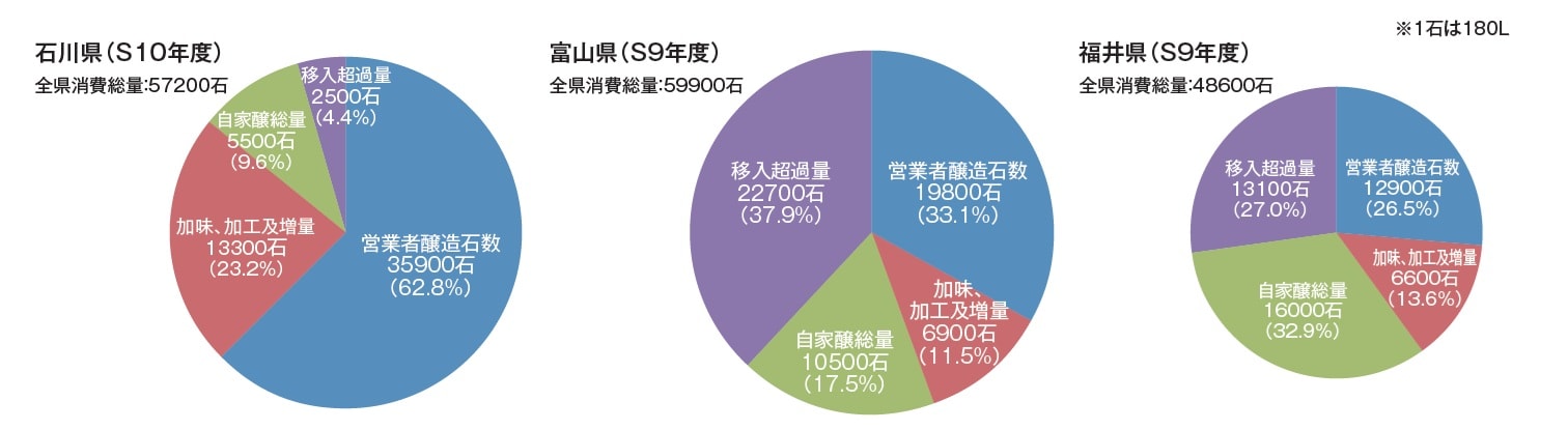 福井県では、大正15年醤油税廃税当時の醸造石数は約2万5千石(450万ℓ)弱であったが、10年後の昭和9年には1万3千石(約230万ℓ)弱に減産している(図3)。その背景には、毎年数軒の醸造元が廃業し平均製造量も微減する中で、自家醸造のしょうゆ造りが増加したといわれる※8)。都市域や町をターゲットに県外の野田・銚子方面からと、石川県、滋賀県からも移入しょうゆがあり、醸造元の製造、自家醸造、移入品の石数が拮抗するような時代であった。