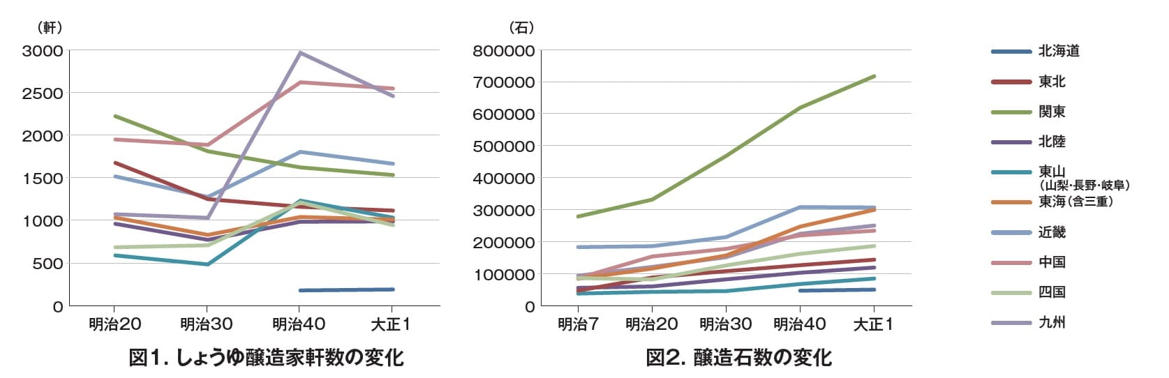 北陸三県のしょうゆ造りを時代ごとにみていく。古い時代で注目すべきは、江戸時代における加賀前田家の御膝元で栄えた金沢・大野醤油の歴史と、越前松平家による福井のしょうゆの発展である。明治時代になるとしょうゆ造りの近代化が進み、全国的にしょうゆの生産量は増加傾向にある中で、しょうゆ醸造業者の数は日露戦争直後の明治40年頃をピークに減少し始める(図1、2)。大正から昭和にかけて自家醸造しょうゆの普及が一時的に進み、北陸でも農山村におけるしょうゆの自家醸造が一般化した。しょうゆ醸造業者は生き残りをかけて、味と品質の向上に凌ぎを削った。
