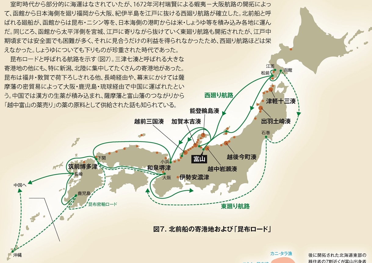 「北陸のしょうゆは甘い」とわざわざいい始めたのは誰だったのだろうか。地域で日常使うしょうゆについては、特に甘いとかからいとか意識しないだろう。他所で味わうしょうゆが食べ慣れた味と随分違うことに気づき、故郷のしょうゆを懐かしんでいうようなことではないだろうか。北陸の甘いしょうゆがどこに運ばれ、故郷の味として消費されたのか、海運を通じて行き来が盛んだった富山県の沿岸部と北海道との接点を探ってみた。