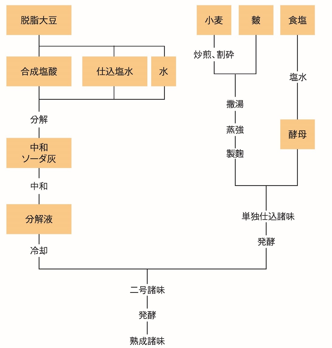 戦後の原料不足からしょうゆ業界を救ったのは、新式2号しょうゆであった。連合国軍最高司令官総司令部(GHQ)のアップルトン女史は、「原料の利用効率が悪く、熟成期間が1年もかかる醸造しょうゆよりも、原料の利用効率が高く、短期間に製造できるアミノ酸液に転換すべき」との方針を出してきた。この醸造しょうゆの欠点を改良したのが野田醤油株式会社によって開発された新式2号法で、昭和23年に野田醤油株式会社は業界存続の為に特許を公開し、業界統一で新式2号法を採用することを決めた。新式2号法とは、脱脂加工大豆を塩酸分解、中和して租アミノ酸液を造り、小麦麹を仕込んでしょうゆ化する方法で、原料の利用率の向上と醸造期間の短縮、さらに旨味の増強も可能にした醸造法である。これにより、GHQの方針は転換し、しょうゆ業界は生き延びたのである。