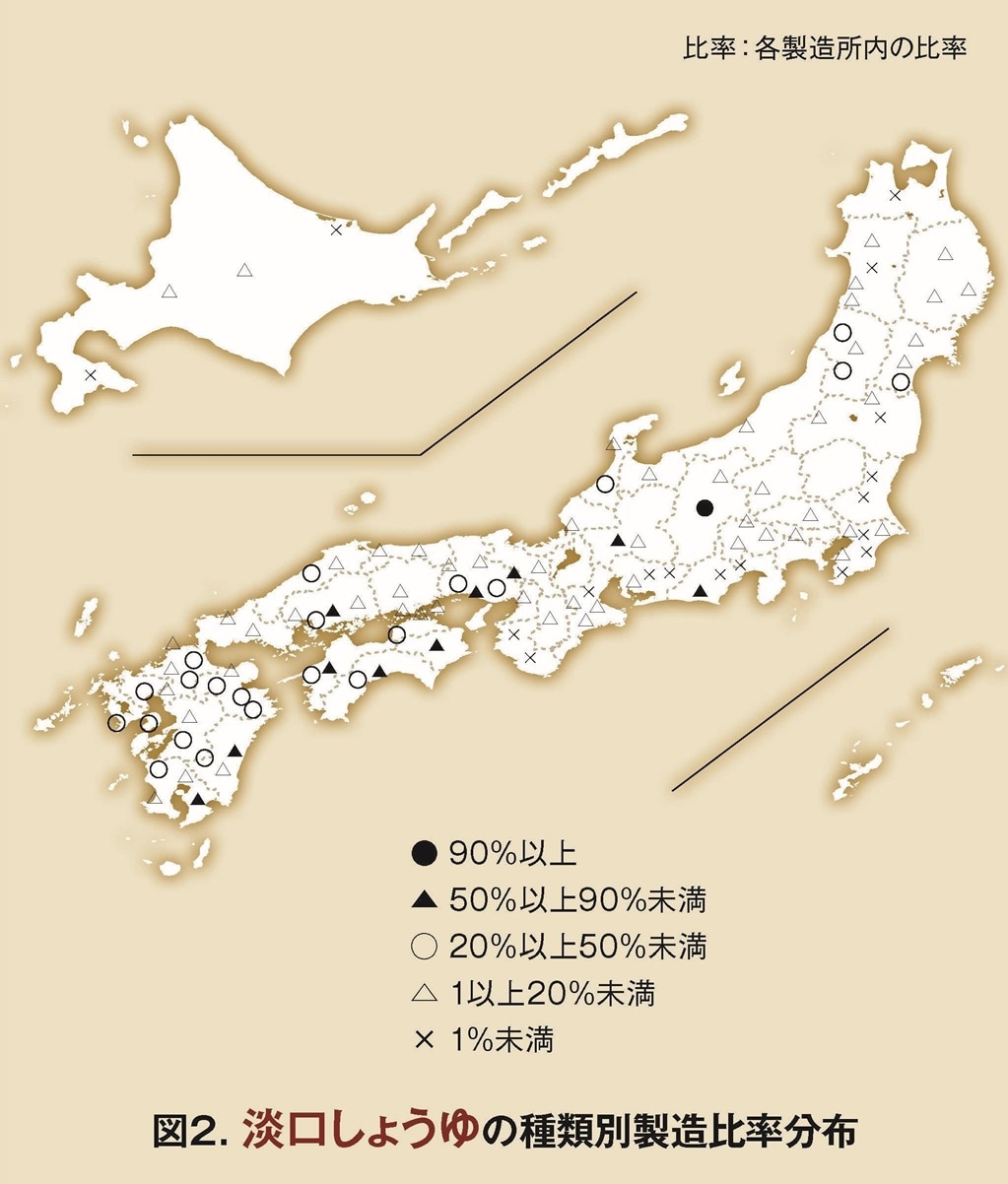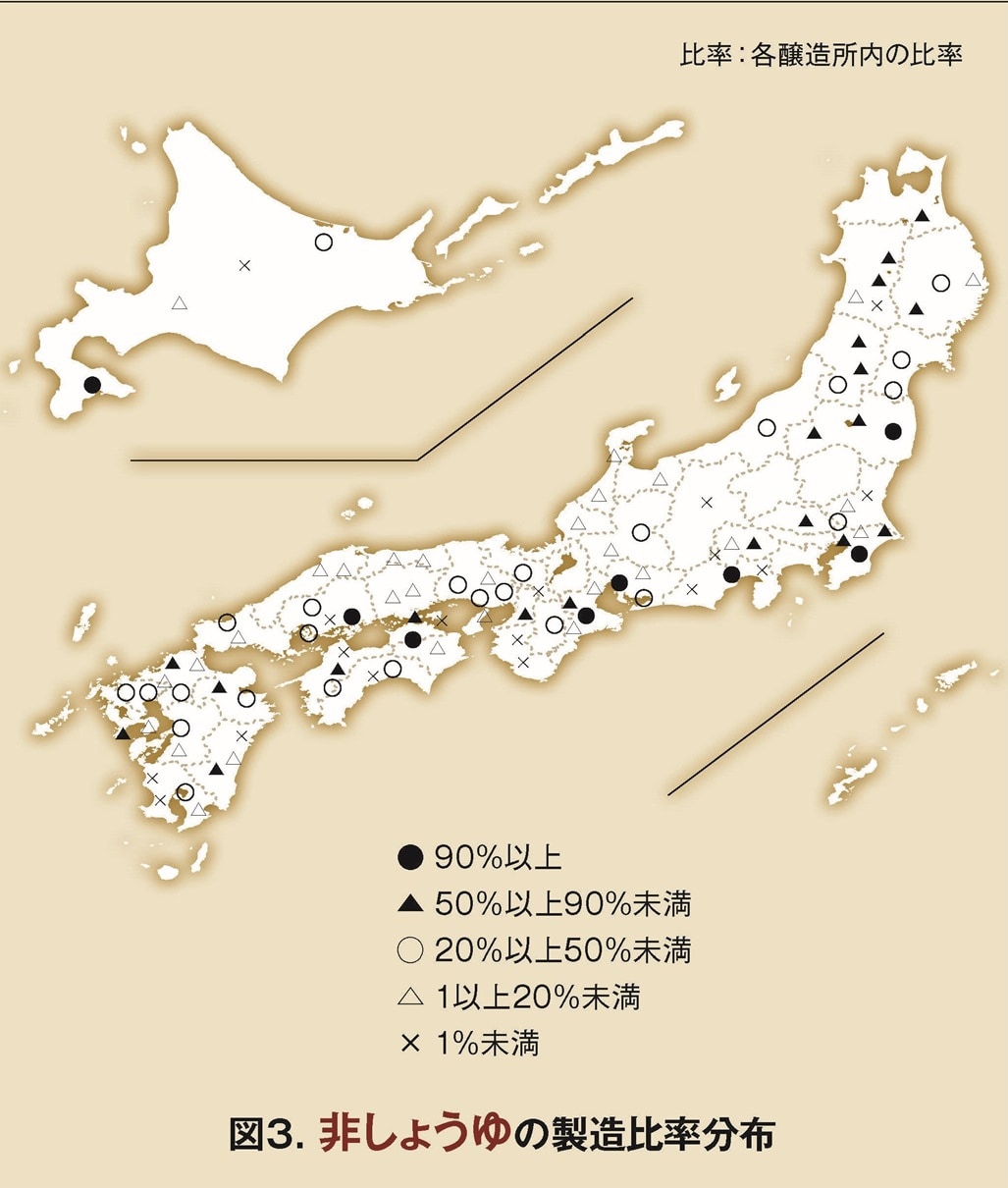 図3は非しょうゆの比率の分布図である。北海道の昆布しょうゆ、東北地方のだししょうゆなどが知られているが、太平洋側の各地の比率が高い傾向が見られる。各醸造所の主力商品も昆布しょうゆ、えごましょうゆ、鰹節だししょうゆ、つゆなどが見られる。そのいっぽうで、蔵造り、丸大豆しょうゆなど本醸造を主力商品としたところ、混合上級規格のしょうゆを主力にし、7割を県内に出荷する一方で、濃口本醸造も県外向けに重要視して製造しているところもある。