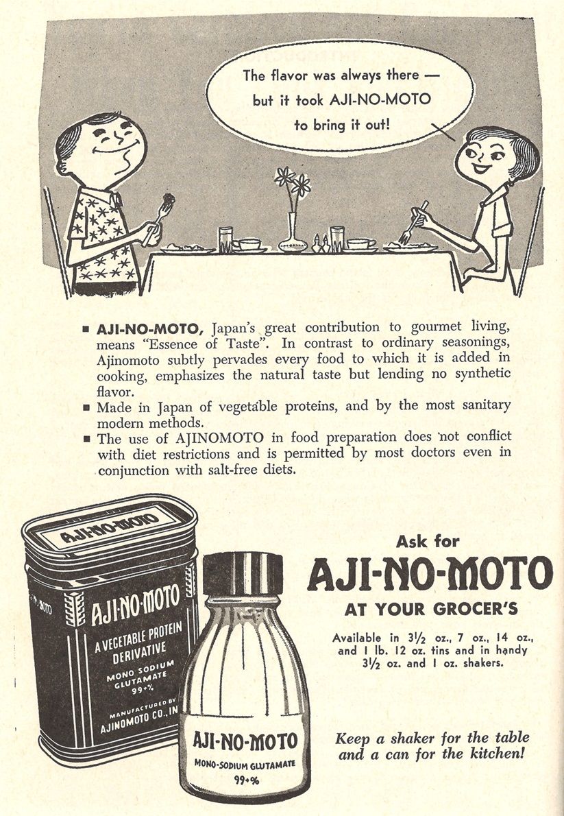 レシピ全体の3分の1ほどにajinomotoが使用されており、shoyuとともに味の素はこの頃からかなり一般的に料理に使われていたと推測される。そしてそれと相まって、この二つの広告はレシピ集の中でも、とりわけ大きく一面広告となっている場合が多い。