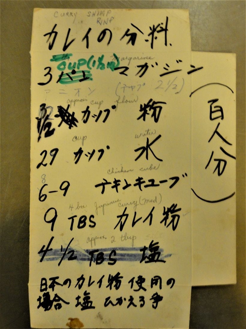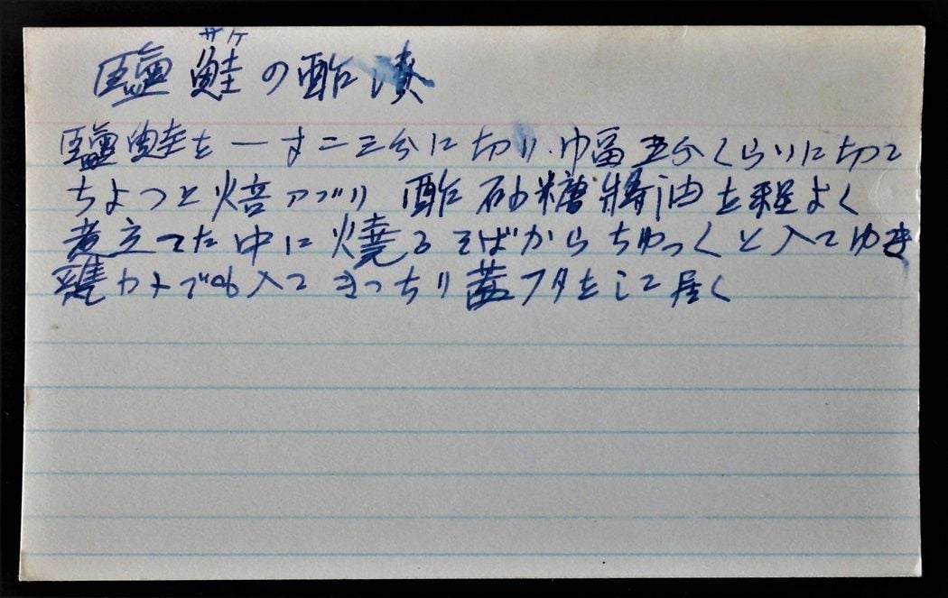 材料を箇条書きにしただけの簡単なものもあれば、手順をしっかりと示したカード式のメモもある。前者はカナダのスティーブストン仏教会で婦人会の方が使っている、「カリント」「カレイ」「チキン(てりやき)」「むしまんじゅう」「Mikasa」である。これらは婦人会でバザーや何かのイベントの際に、おおぜいでたくさん作る時に、情報共有のために誰かが書き残し、それが受け継がれているもののようだ。ローマ字書きや、鉛筆で英語訳が付けられていることから、異なる世代へも伝えられている。「百人分」との記載があるように、婦人会では様々な機会におおぜいの人数に対して、食事を提供する活動を担っている。従って、その仕事は協同作業であり、参加者全員が情報共有して取り組まなければならない。それゆえのメモでもあるわけだ。