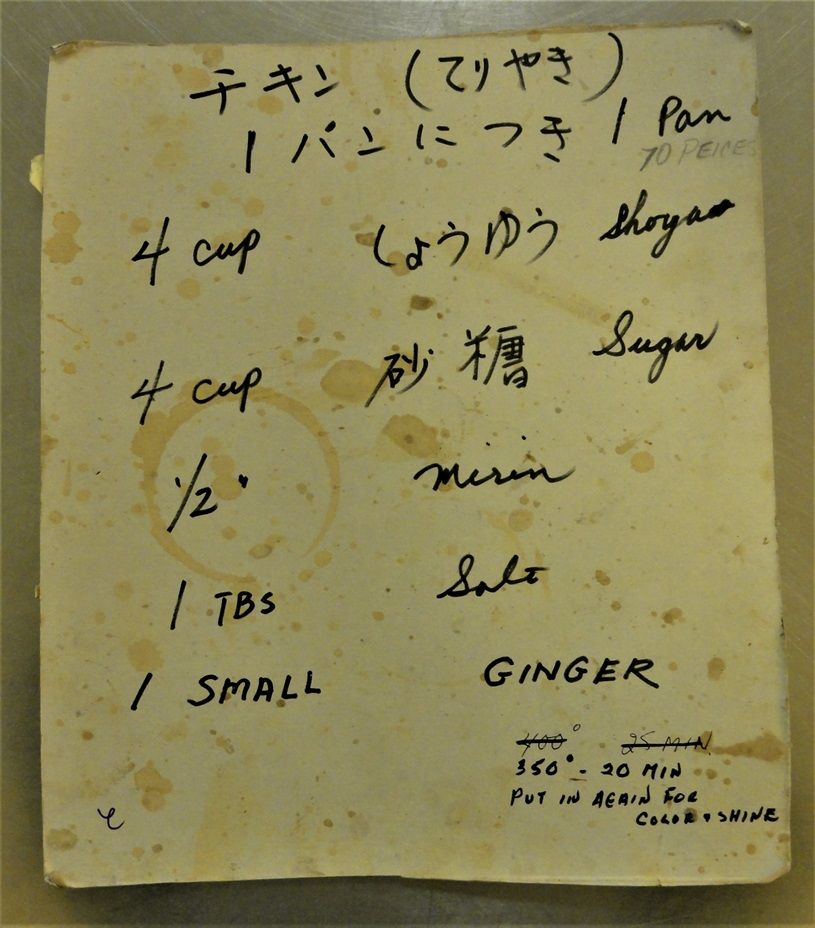 現在では、レシピ集というかたちで、様々なレシピが集められ、1冊の本として印刷され広く一般に共有されることは普通になった。しかしかつては、レシピは母から娘へ、あるいは知人へと、口伝えで、あるいはメモ書きによって、個人レベルで伝える時代があった。その名残は、今でも日系人の間で、おそらくどこかで残っているのではないかと想像していた。そして、その推測は的中した。仏教会婦人部のメモとして、博物館の資料として保管され、残されていた。あるいはまた、どこかの家庭にまだ眠っているかもしれない。