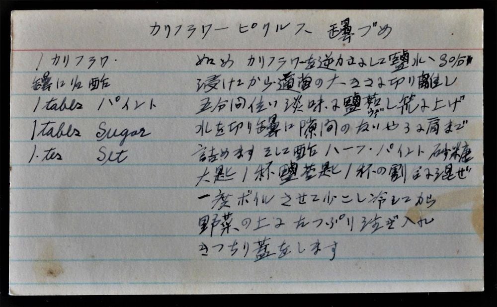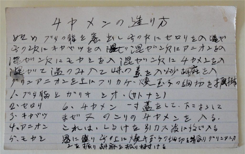 バンクーバーにある日系ナショナル博物館には、下のようなレシピカードが資料として保管されている。「チャメン」は炒麺 Chow mein のことで、上記でも言及したが、北米日系人の外食の想い出としてよく語られるメニューである。多くの二世は、子どもの時に家族で外食した想い出として、チャーメン(五目中華焼きそば)を食べたと語っている。それを家庭でも作っていたという証拠になるだろう。そのほか、「カリフラワーのピクルス瓶詰」、「塩鮭の酢漬」、「醤油製法」、「納豆 造り方」などのレシピカードがあることから、これらは日系人のあいだで作られていた、あるいは現在も作られているかもしれない。