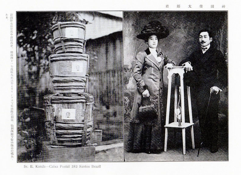 今から100年以上前、1908年にブラジルへ渡った最初の日本人集団移民、笠戸丸(かさとまる)移民の一人が、すでに醤油の生産を始めている。新潟県北蒲原郡中浦村(現在の新発田市)出身の神田栄太郎である。1914年頃、サントス市で商業的醸造を始めたパイオニアとされている。しかし、その人物像や製造の背景、どのような醤油だったかについては、何ら情報が残されていない。このほかにも、出版物に掲載された広告には、「藤澤」「黒島」「まるやま」などの醤油会社の名前が見られるが、それ以上の情報は残っていない。外国に渡った日本人移民にとって、食は大きな課題であったが、ブラジルでは米があったことでたいへん助かったとされており、半田によれば「味噌・醤油・米飯」という基本的食生活はかなり一般化していたらしい*2。