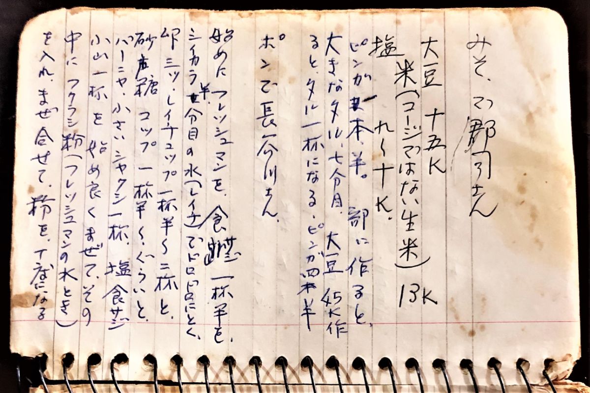「味噌はまず最初にお米で麹を作りなさい。麹ができる頃になると、今度は大豆。大豆は洗ってうろかして(水に浸けて)おいて、頃よく炊いて。あんまり過ぎたら、今度は潰す時にたいへんだから、ええ頃合いにして、しなさい。」「そう言われて私もすいぶん豆挽きを手伝った。」「その挽いた豆と置いておいた麹、それと塩を混ぜて。そしてお酒でも入れたらおいしいんだけどねって。でもお酒はなかなか買えない。そしたら、ブラジルではサトウキビから作るピンガ(サトウキビを原料としたブラジル原産の蒸留酒)をちょっと入れて。そうすると早く発酵しておいしくなるんだと言われた。」「醤油の場合は、大豆を炒って置いておき、米で麹を作って。できた麹を、しまっておいた大豆とを混ぜて、木の桶に入れて塩を混ぜた。塩の分量も教えてもらっていた。そして水を注して、毎日長い棒で混ぜていた。」 |